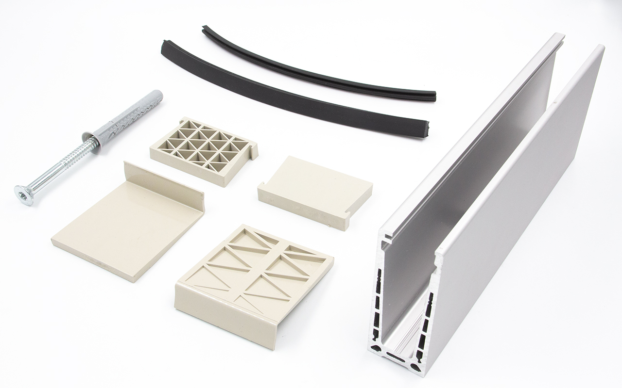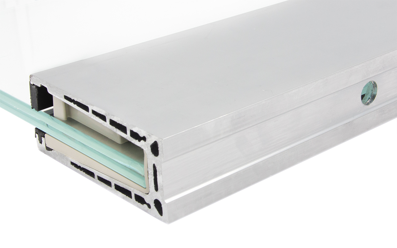 Профиль крепится на горизонтальную поверхность через отверстия просверленные в нижней части профиля. Также профиль может быть смонтирован к боковой поверхности. Стекло вставляется сверху, зажимается распорными клиньями через уплотнительные резиновые прокладки. монтажный паз профиля закрывается резиновой накладкой. Накладки под любую толщину стекла - от 10 до 16мм входят в комплект поставки. Дополнительно можно приобрести декоративные накладки из полированной стали и торцевые заглушки.