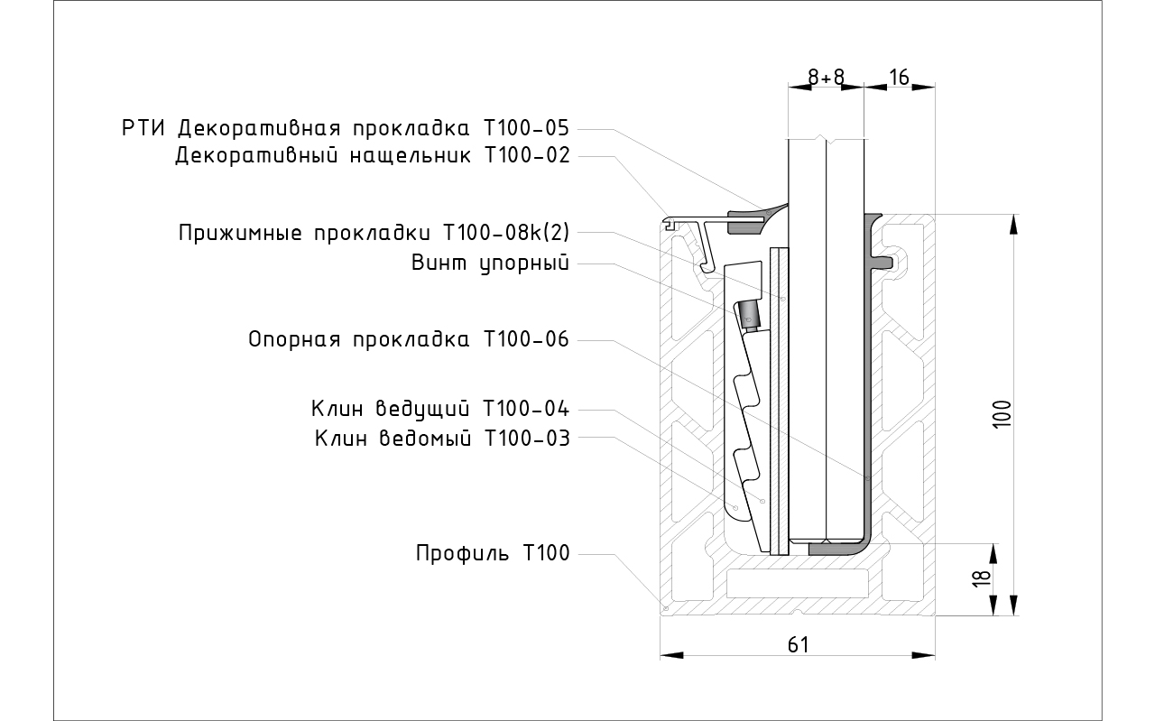 Системы зажимных алюминиевых профилей т100 предназначены для 8 типов размеров зажимаемых закаленных стекол: , , , , а также триплекса , , ,