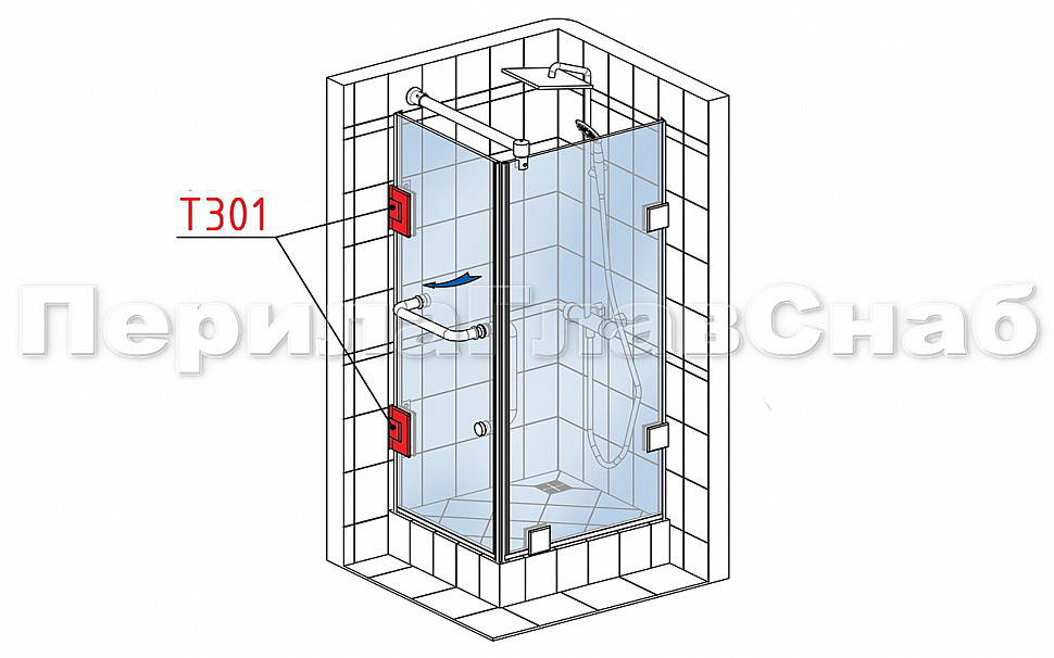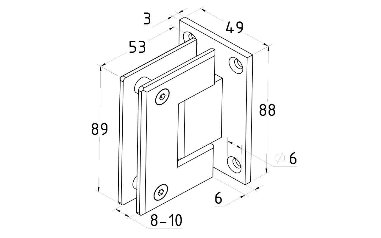 Петля из нержавеющей стали с полированной поверхностью из нержавеющей стали предназначена для стыковки между собой конструкционных элементов из стекла, толщина которых находится в диапазоне от 8 до 10 мм. Максимальный вес двери на 2 петли составляет 45 кг. В конструкции заложена система скрытого крепежа. Имеет функцию доводчика до закрытия от 25°. Максимальный угол разведения стыковочных элементов в плане составляет 90°. Крепление предусмотрено с двух сторон на 4 винта со шляпками заподлицо (по 2 винта на каждую сторону). Размер одной стороны петли составляет 90х55 мм.
