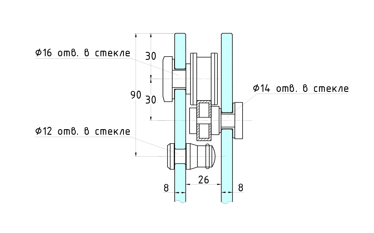 7. На дверь установить верхние ролики из комплекта в подготовленные вырезы в стекле. Сверху прикрепить дверь дверь и затянуть ролики.