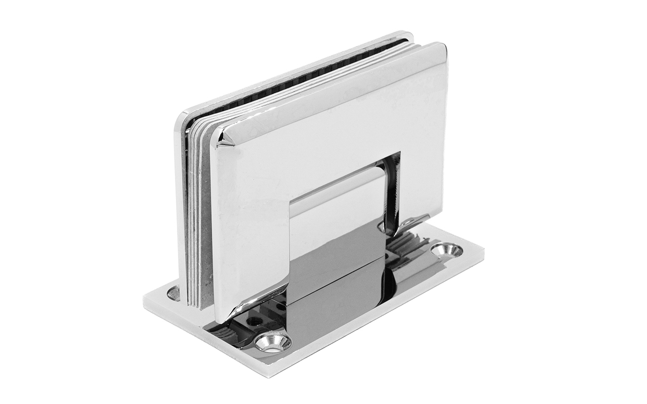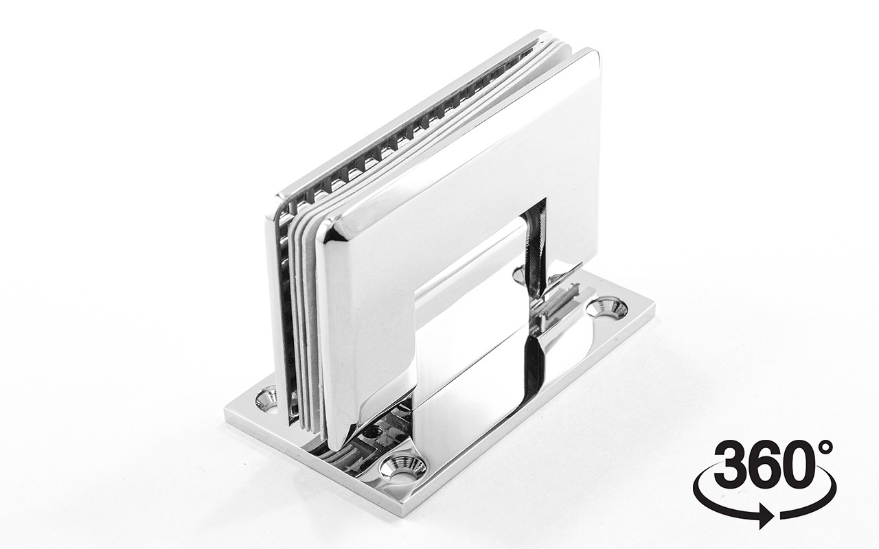 Петля из латуни с полированной поверхностью из хрома предназначена для стыковки между собой конструкционных элементов из стекла, толщина которых находится в диапазоне от 8 до 10 мм. Максимальный вес двери на 2 петли составляет 45 кг. В конструкции заложена система скрытого крепежа. Имеет функцию доводчика до закрытия от 25° градусов. Максимальный угол разведения стыковочных элементов в плане составляет 90° градусов.