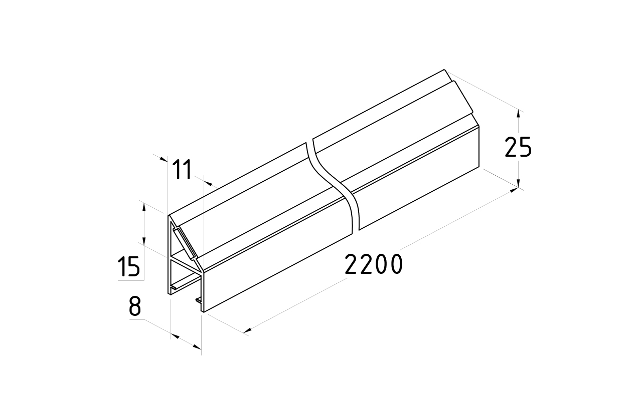 Длина 2200 мм. Монтируется по всему периметру стеклянного листа. Позволяет соединять стеклянные панели между собой