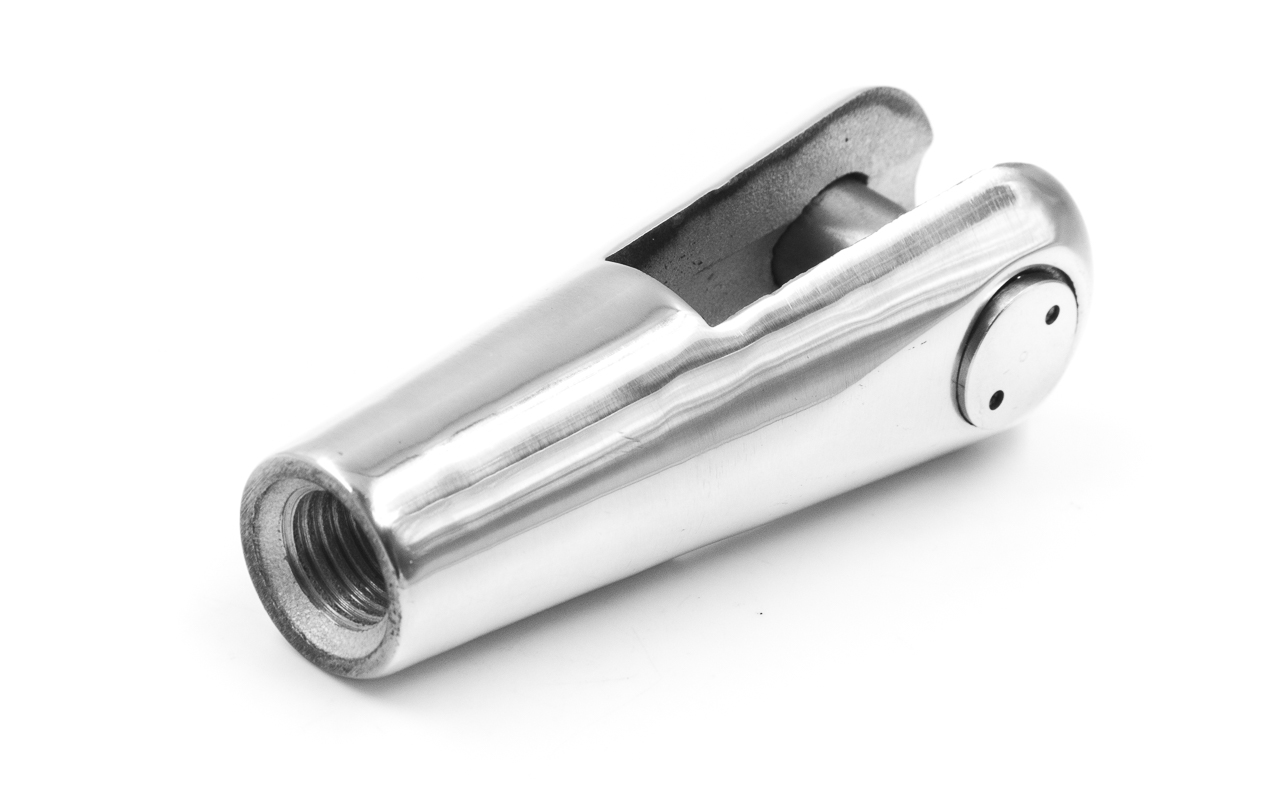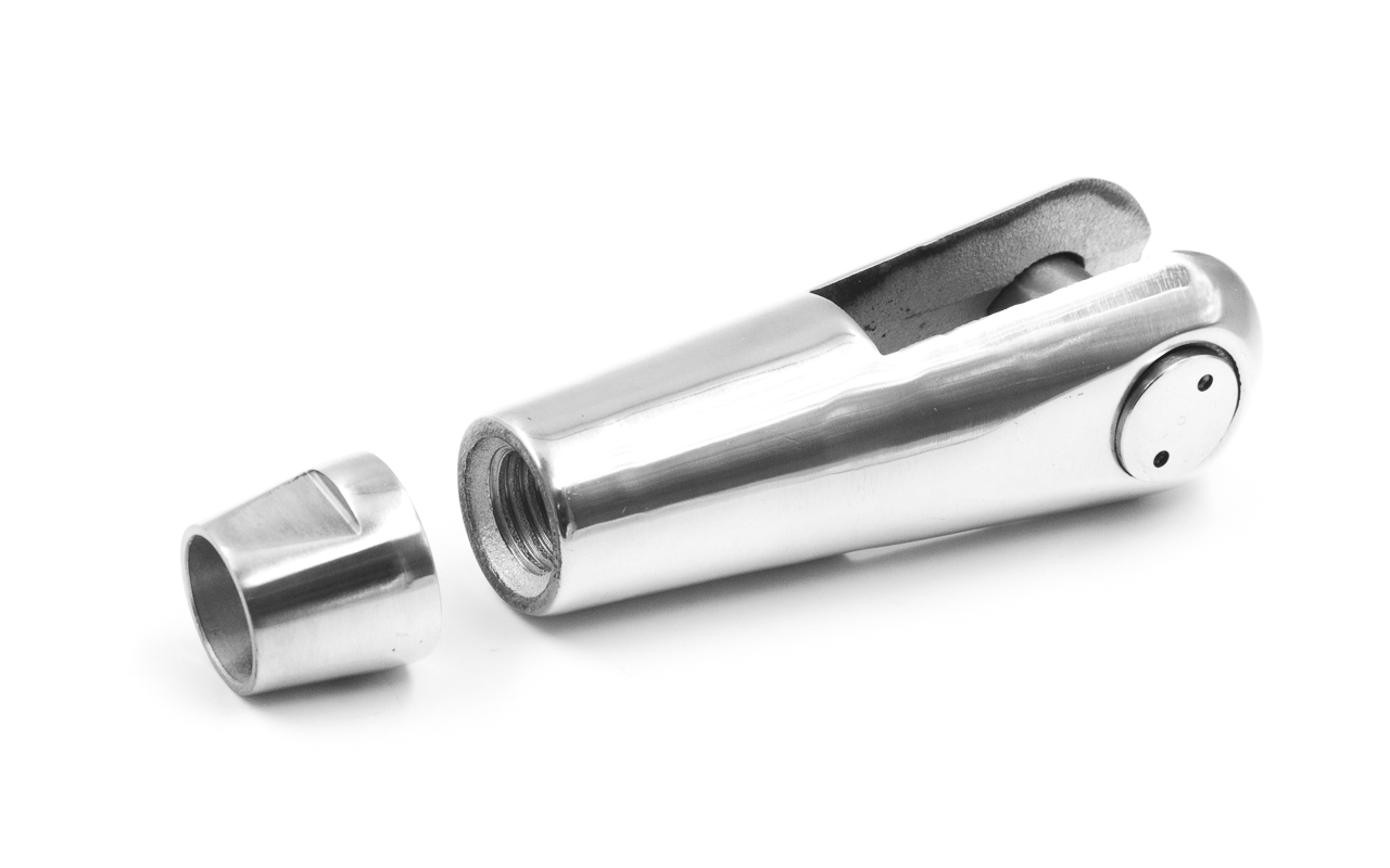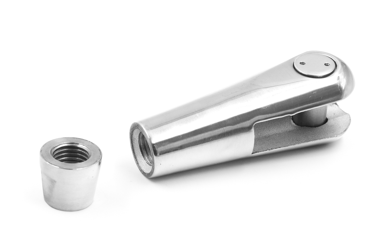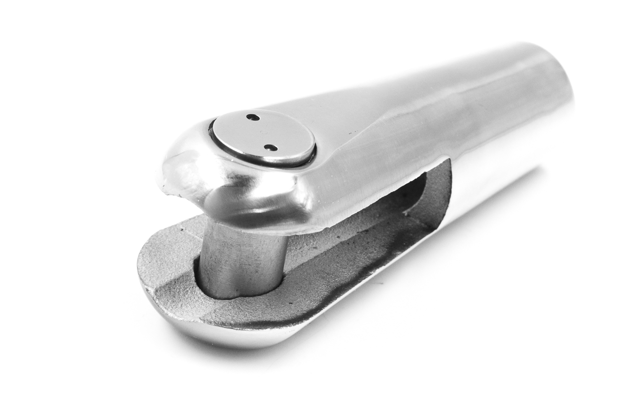 для крепления к серьге. Деталь выполнена из стали AISI 304. Длинна наконечника 138 мм от начала ванты до середины фиксатора. Ширина 34 мм. Длинна паза в месте расположения фиксатора 50 мм, а ширина 15 мм. Выдерживает
