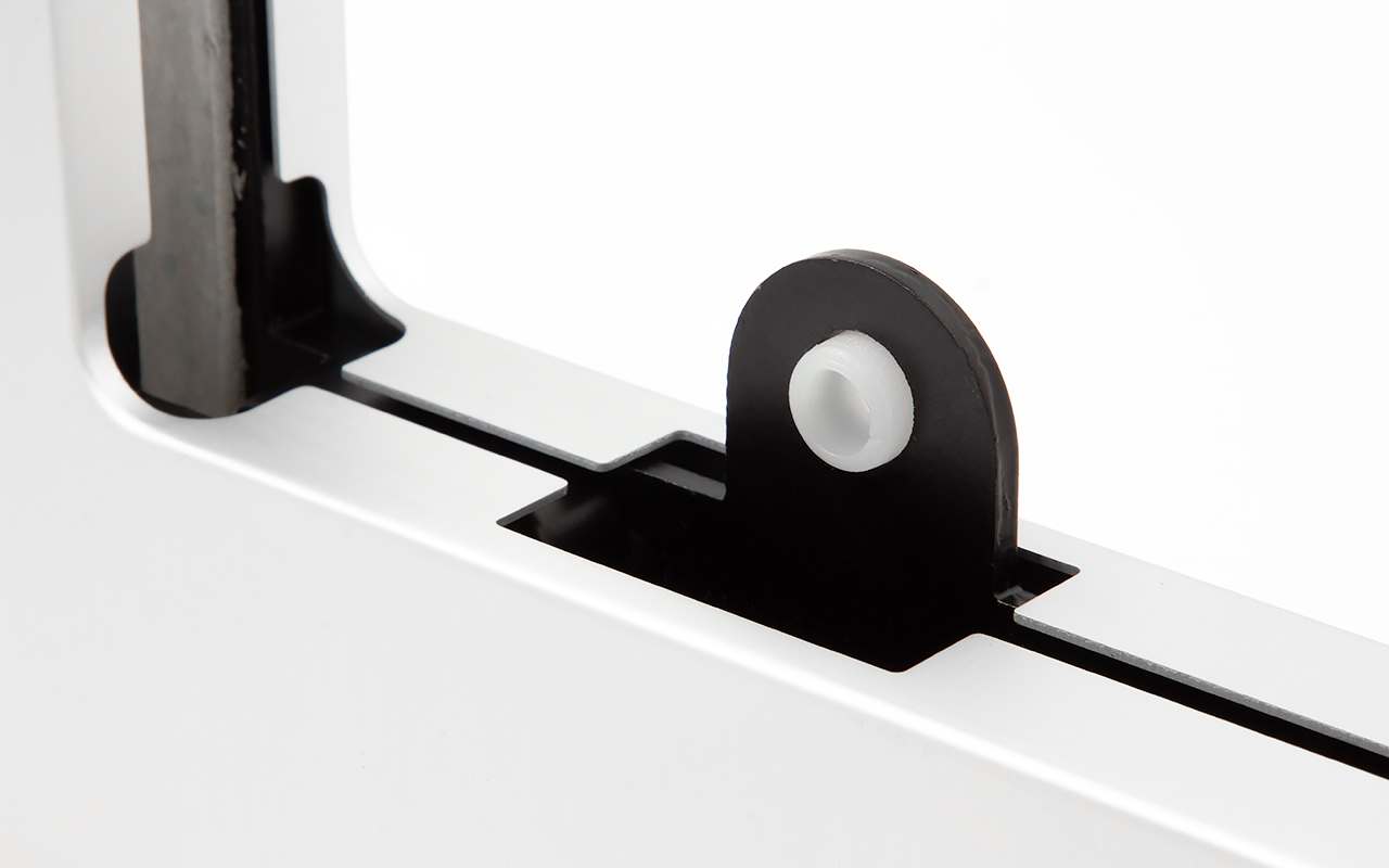 сбоку нажимаем на крепления крышек и снимаем. Отвинчиваем винты, и фиксируем фитинг в подготовленный вырез в стекле. Далее закручиваем и фиксируем обратно крышки.