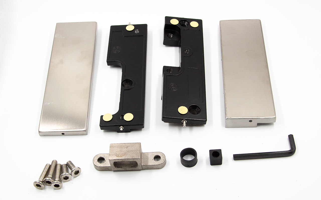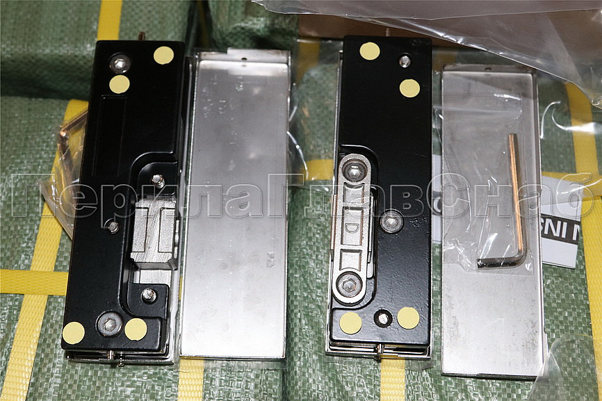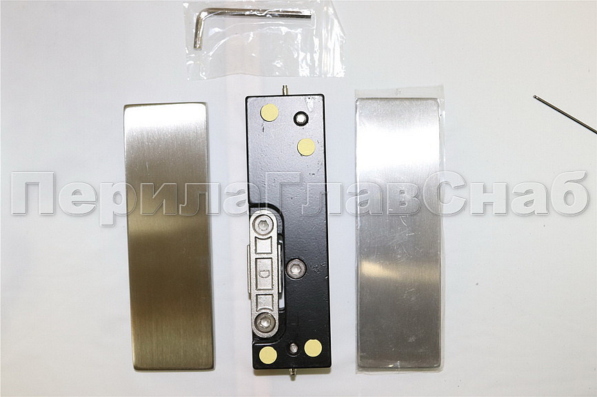 Устанавливается на шпиндель напольного доводчика. Для установки стекла 8 мм комплектуется дополнительной асбестовой прокладкой t111 2мм толщиной. Сбоку нажимаем на крепления крышек и снимаем. Отвинчиваем винты, и фиксируем фитинг в подготовленный вырез в стекле. Далее закручиваем и фиксируем обратно крышки.