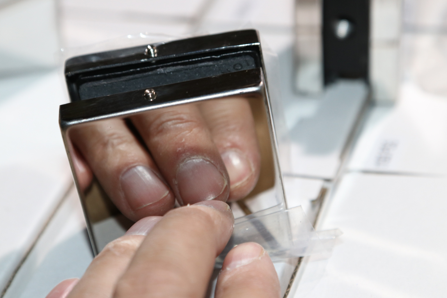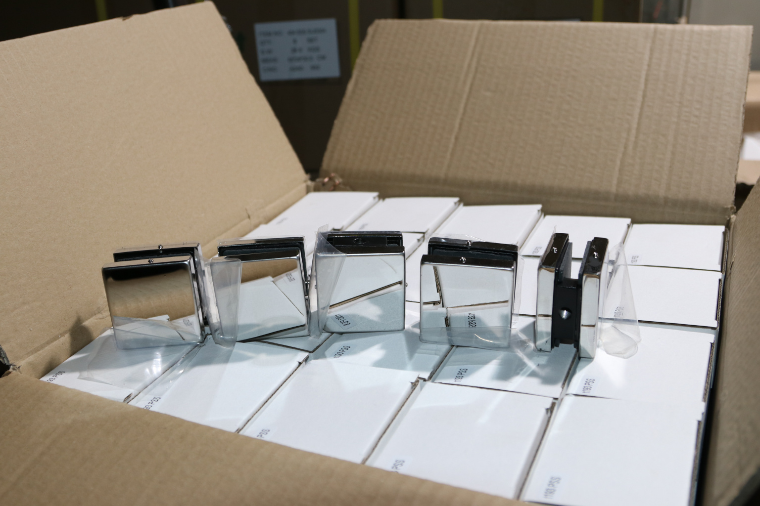 Коннектор разбирается на две половинки, Г-образной стороной крепится к стене на саморезы. Затем к нему прикладывается стекло со специальными полукруглыми вырезами, а далее второй половинкой стекло зажимается.