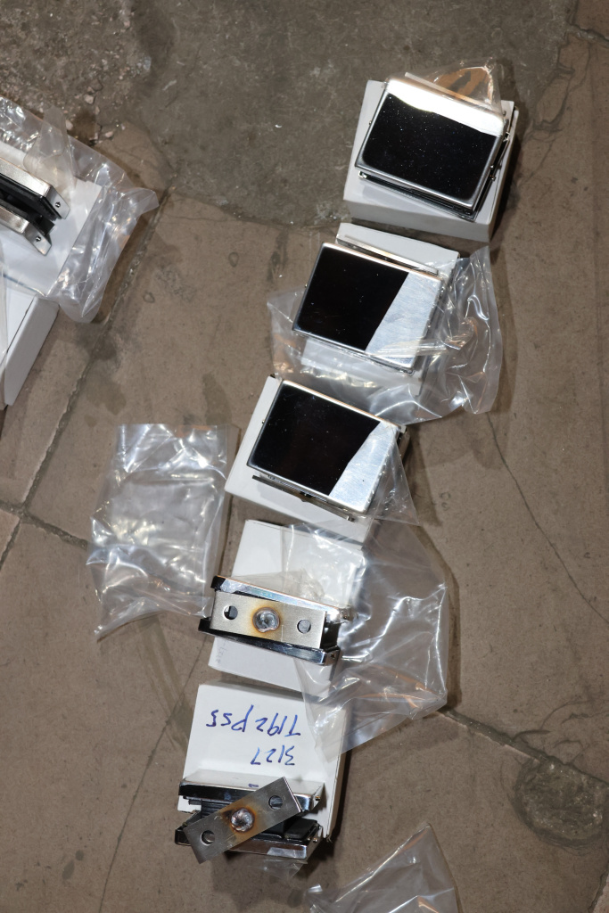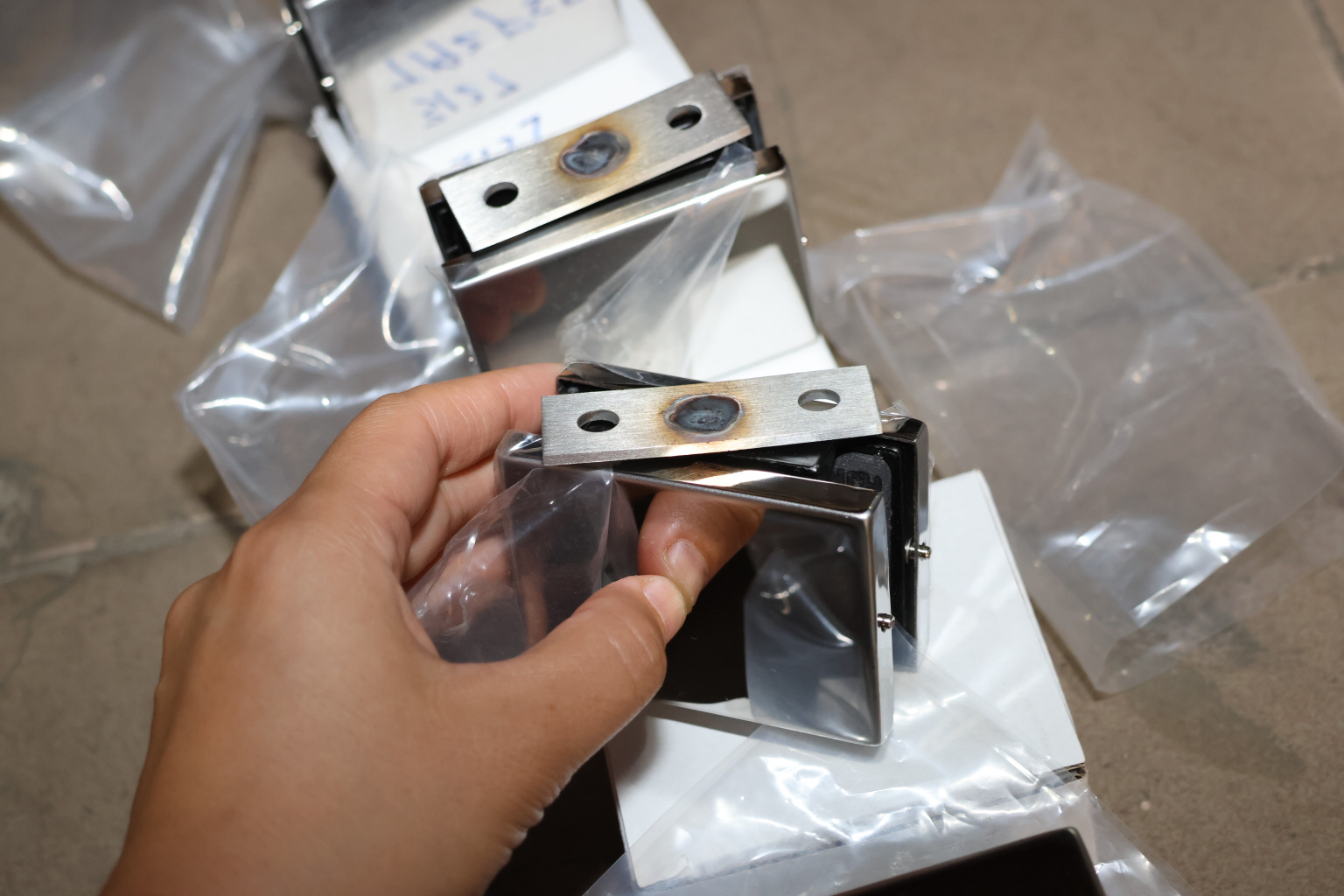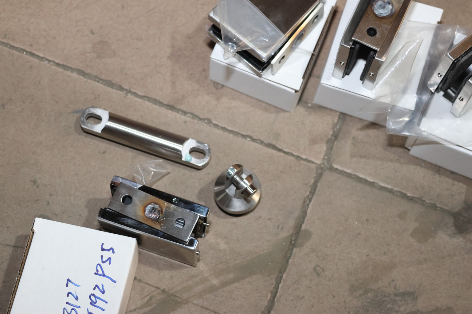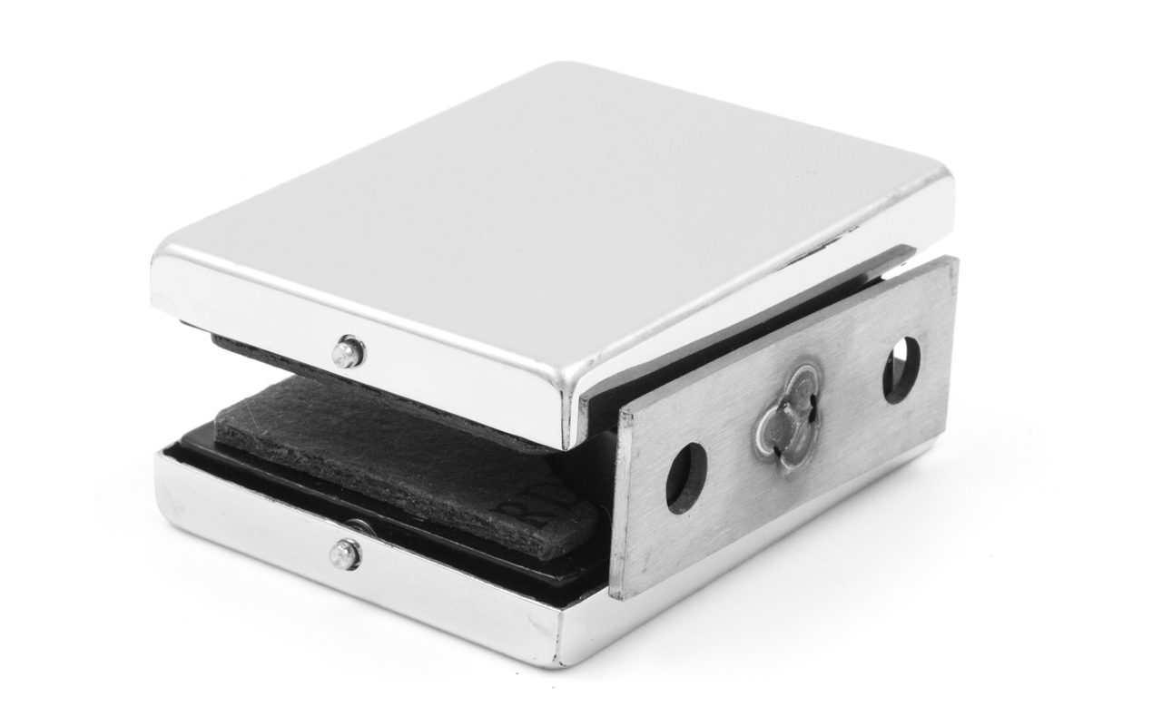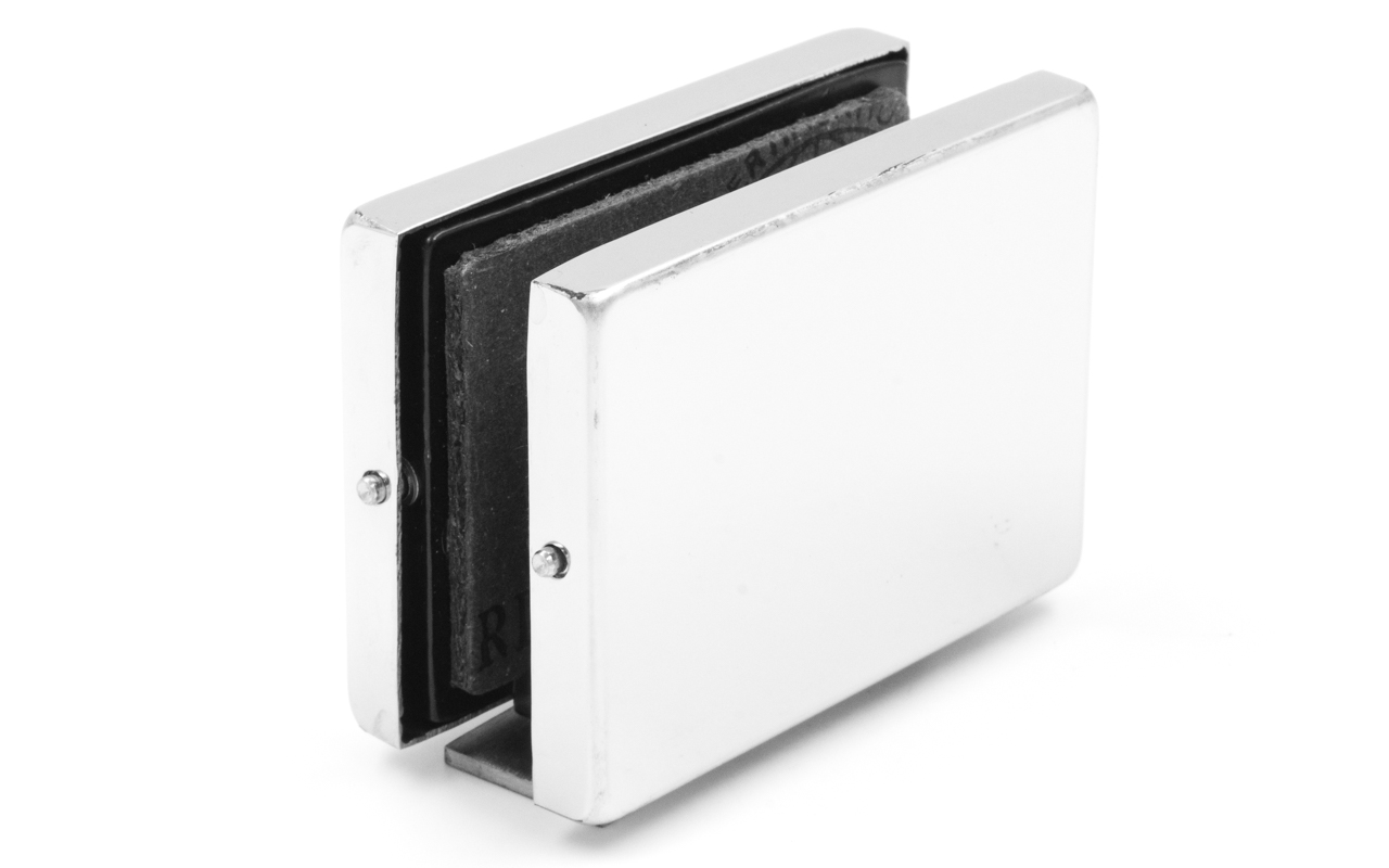 Коннектор разбирается на две половинки, основание металлической пластины крепится к стене на саморезы. Затем к нему прикладывается стекло со специальными полукруглыми вырезами, и далее второй половинкой стекло зажимается.