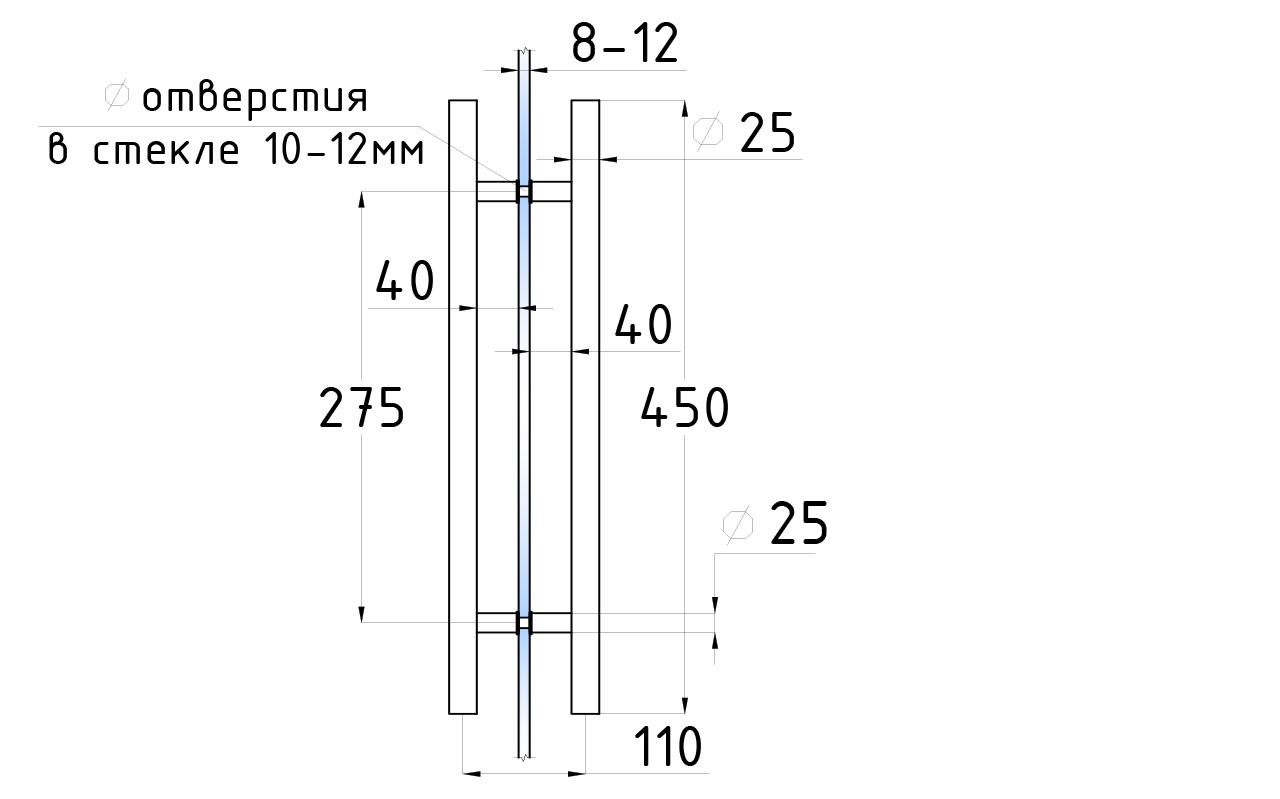 Ручка для стеклянной двери рейлинг двухсторонняя для стекла 8-12 мм, 25x275x450 мм, полированная t633-450 PSS