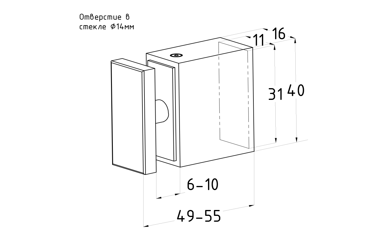 Предназначен для соединения штанги в душевых кабинах, позволяя соединить ее без сварки. Служит для крепления прямоугольного трека к стеклу. Крепится к стеклу через отверстие 14мм. Габаритные размеры прямоугольной станки составляют 30х10 мм.