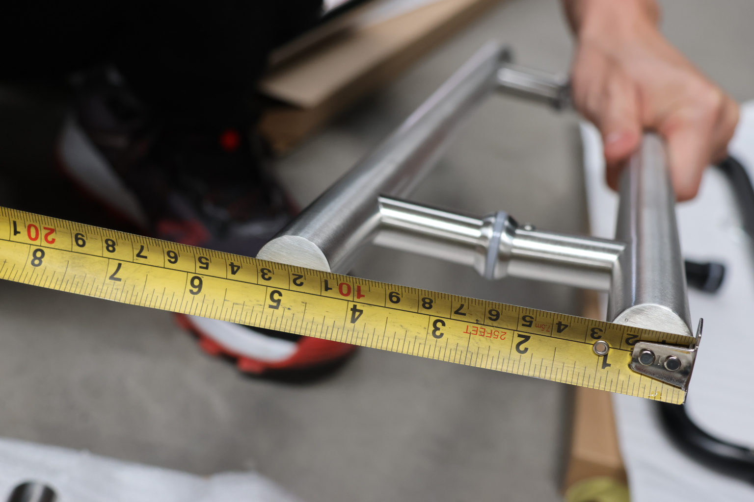 у основания ручки откручиваем с помощью шестигранника винты, делим ручку на две части, в заранее заготовленные отверстия вырезы в стекле 10-12 мм фиксируем первую часть ручки в отверстиях и с обратной стороны ответную часть затягиваем с помощью шестигранника