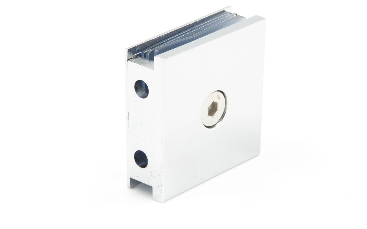 Коннектор разбирается на две половинки, Г-образной стороной крепится к стене на саморезы. Затем к нему прикладывается стекло с заранее заготовленным вырезом согласно чертежу, а далее второй половинкой стекло зажимается.
