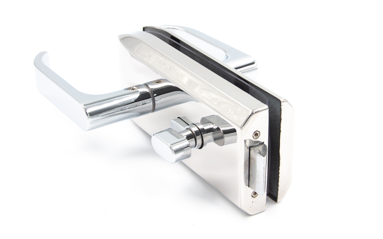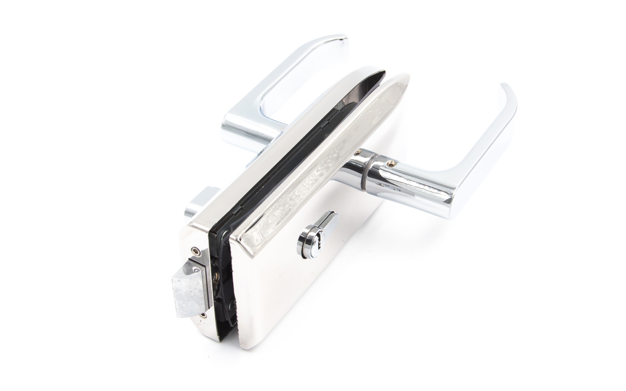 Замок с нажимной ручкой монтируется на стеклянную дверь, толщина стекла 8-12 мм.