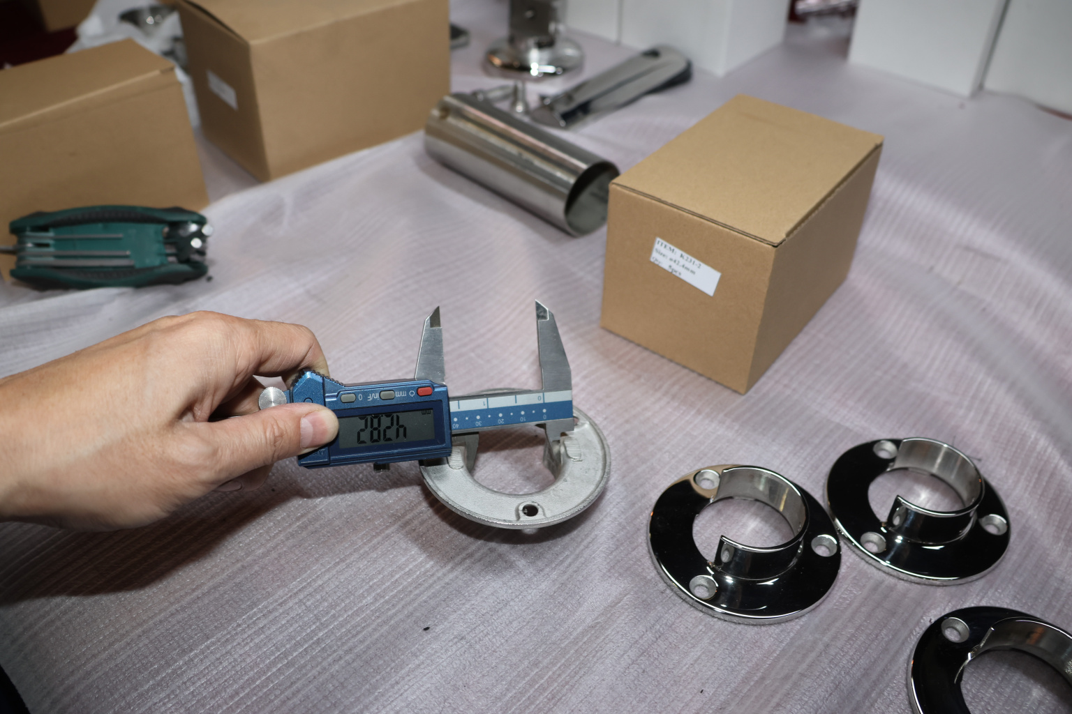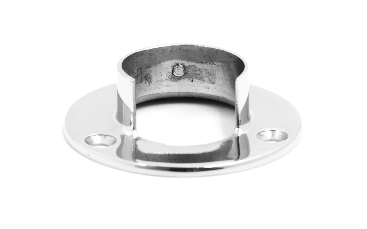 Фланец для трубы диаметром 42.4 мм. С тремя отверстиями под саморез с потайной головкой 6.8 мм. Деталь литая, полированная. Марка стали - AISI 304.