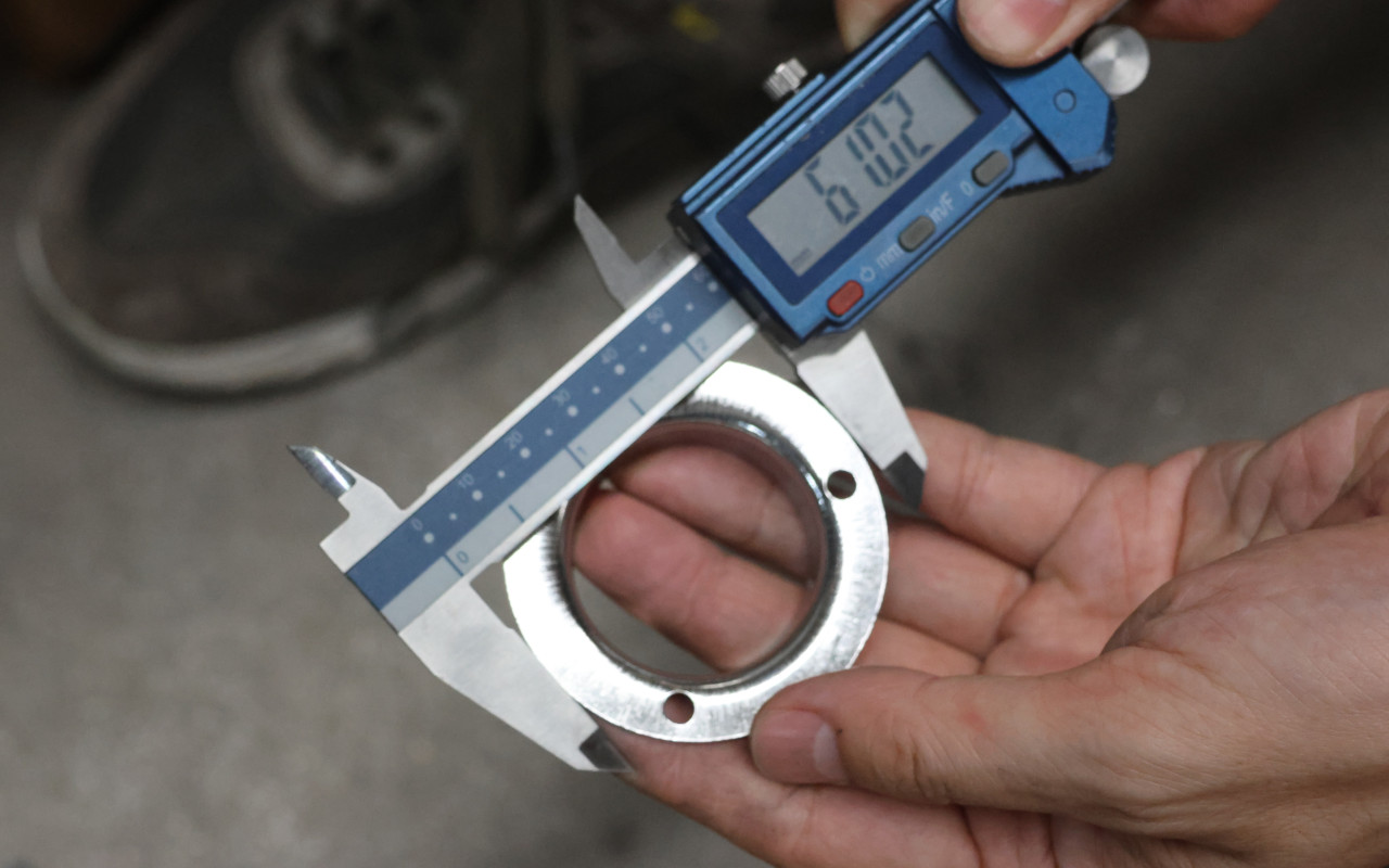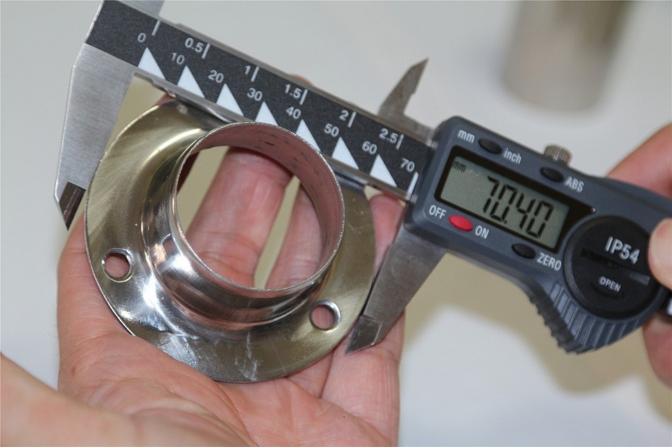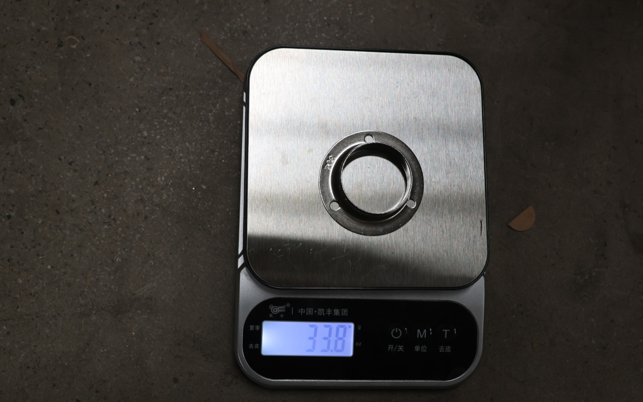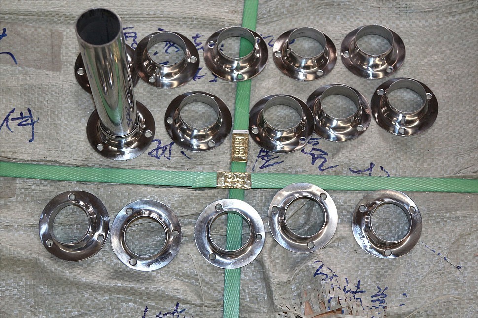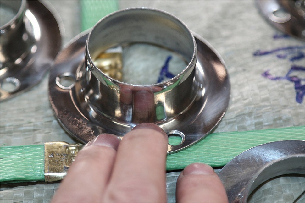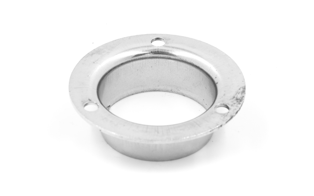 Фланец штампованный с тремя отверстиями, внешний. Диаметр 68 мм, полированный. Деталь для трубы диаметром 38.1 мм, толщина 1.3 мм. Марка стали - AISI 304