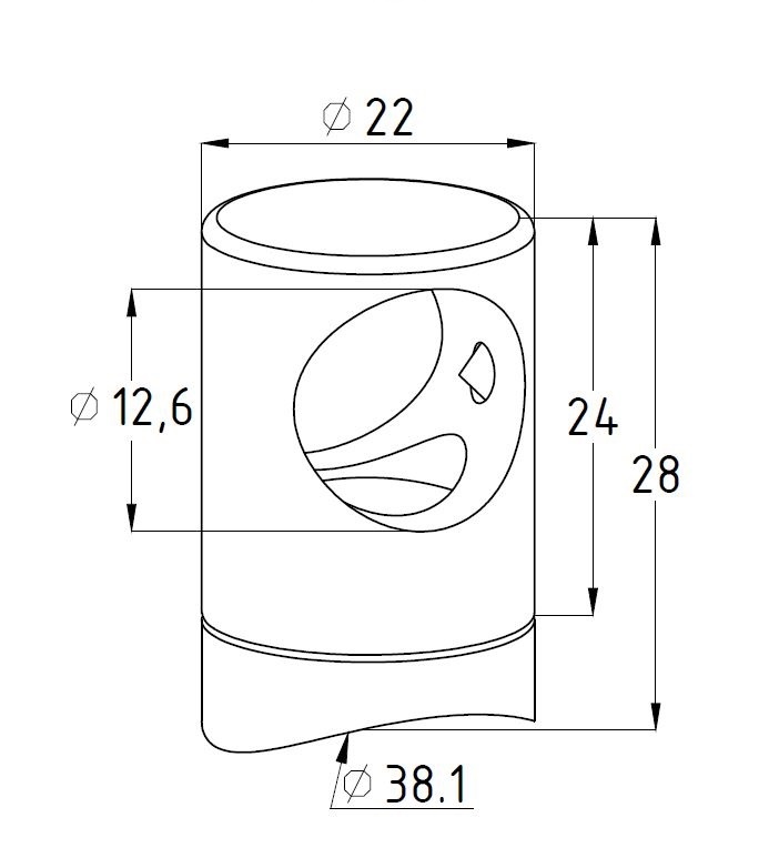 Предназначен для крепления нержавеющего ригеля Ø12 (тетивы, струны) к стойке диаметром 38.1 мм ограждения с ригелями.