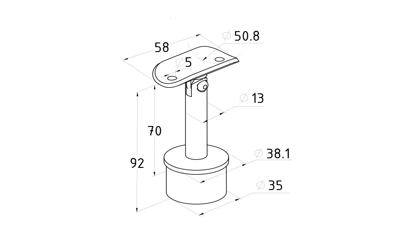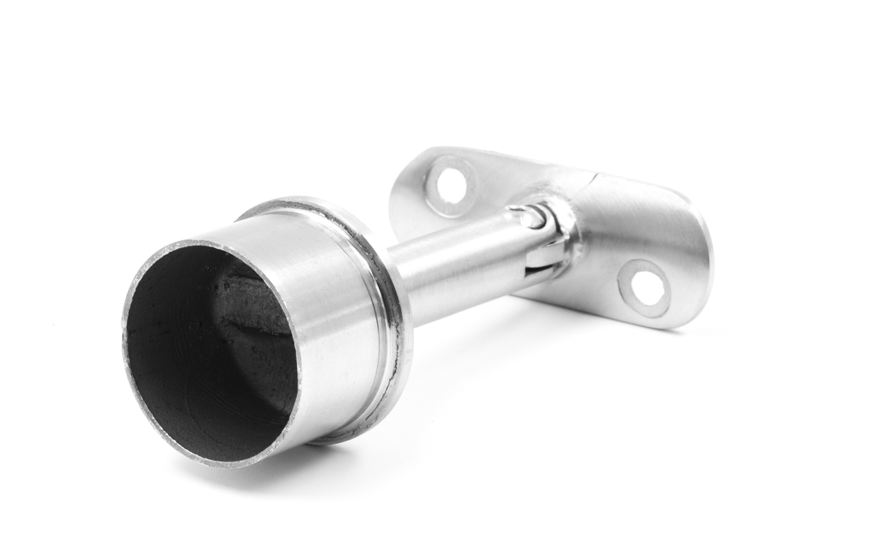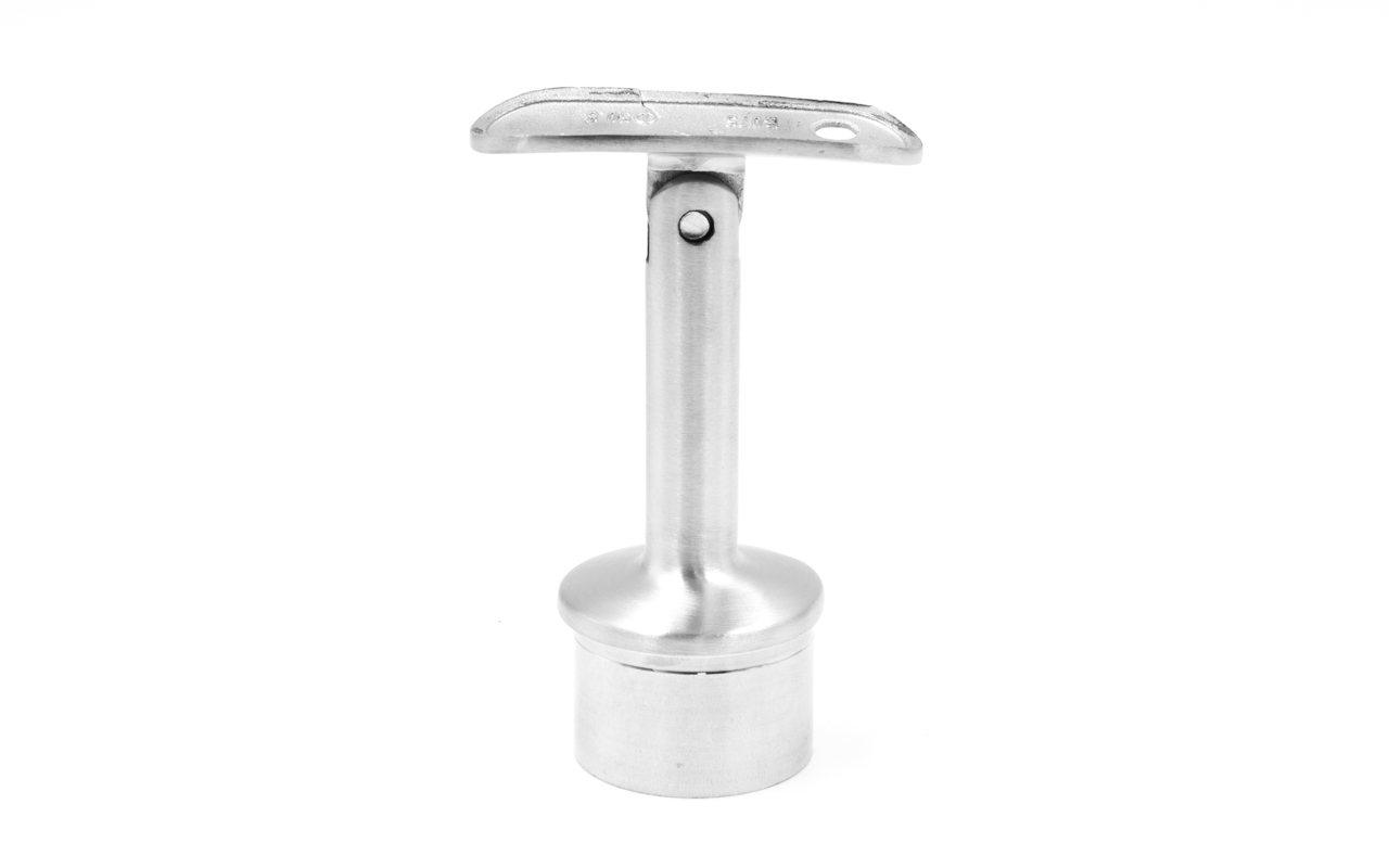 Просто вставляется в стойку диаметром Ø38.1 мм. Крепится на специальный клей (Ф-1105, Ф-1106, Ф-1107) или просто приваривается. Ложемент у этой модели регулируемый с двумя отверстиями под саморезы. Подходит под поручень диаметром 50-60 мм.
