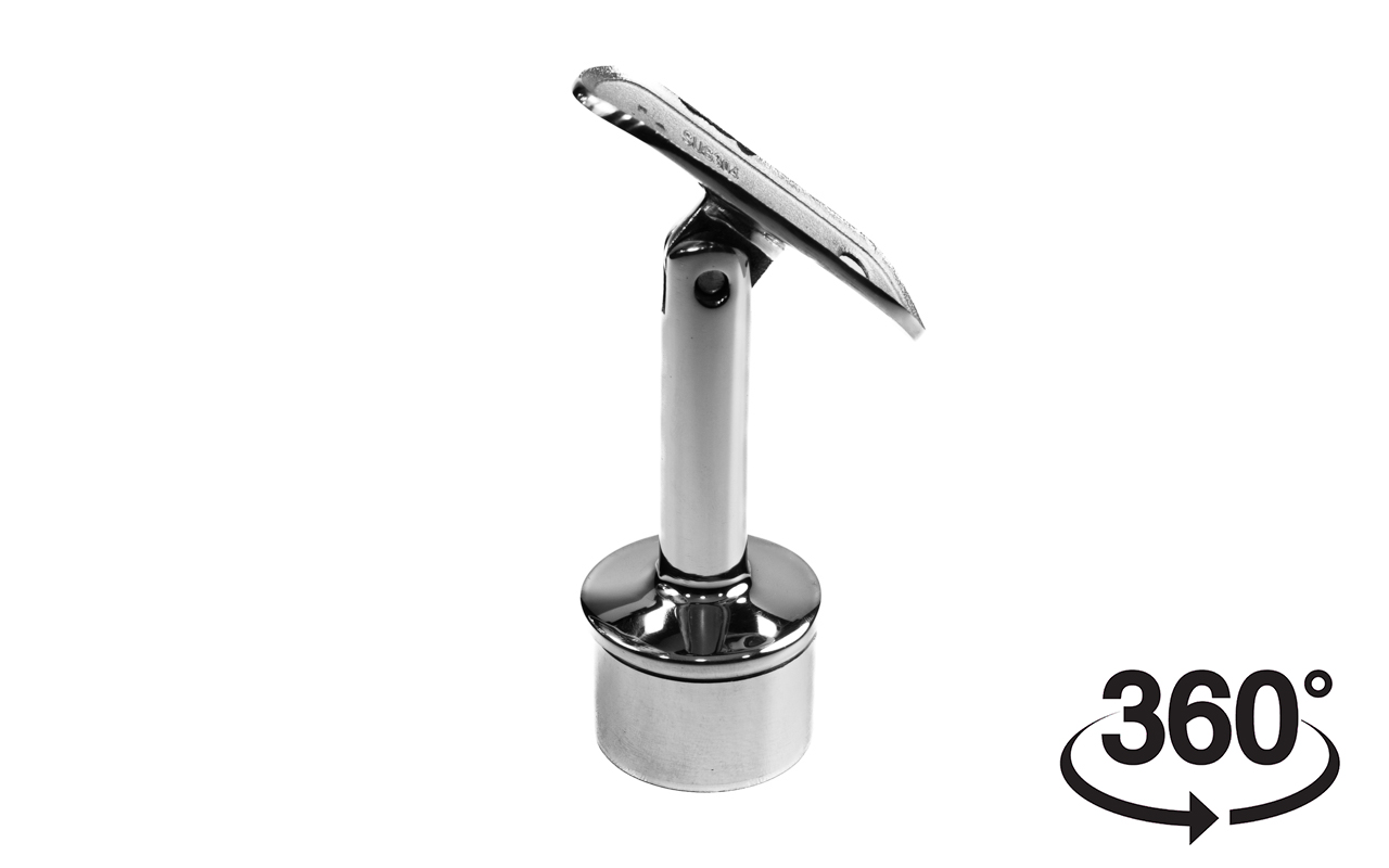 Предназначен для стойки Ø38.1 мм (k819, k849) под поручень Ø38,1-42,4 мм. Деталь с регулируемым ложементом и отверстиями под саморезы. Можно крепить как на сварку, так и на специальный клей ( , ). На сегодняшний день это наиболее распространенный тип наконечников стоек, повсеместно используемый в монтаже ограждений.