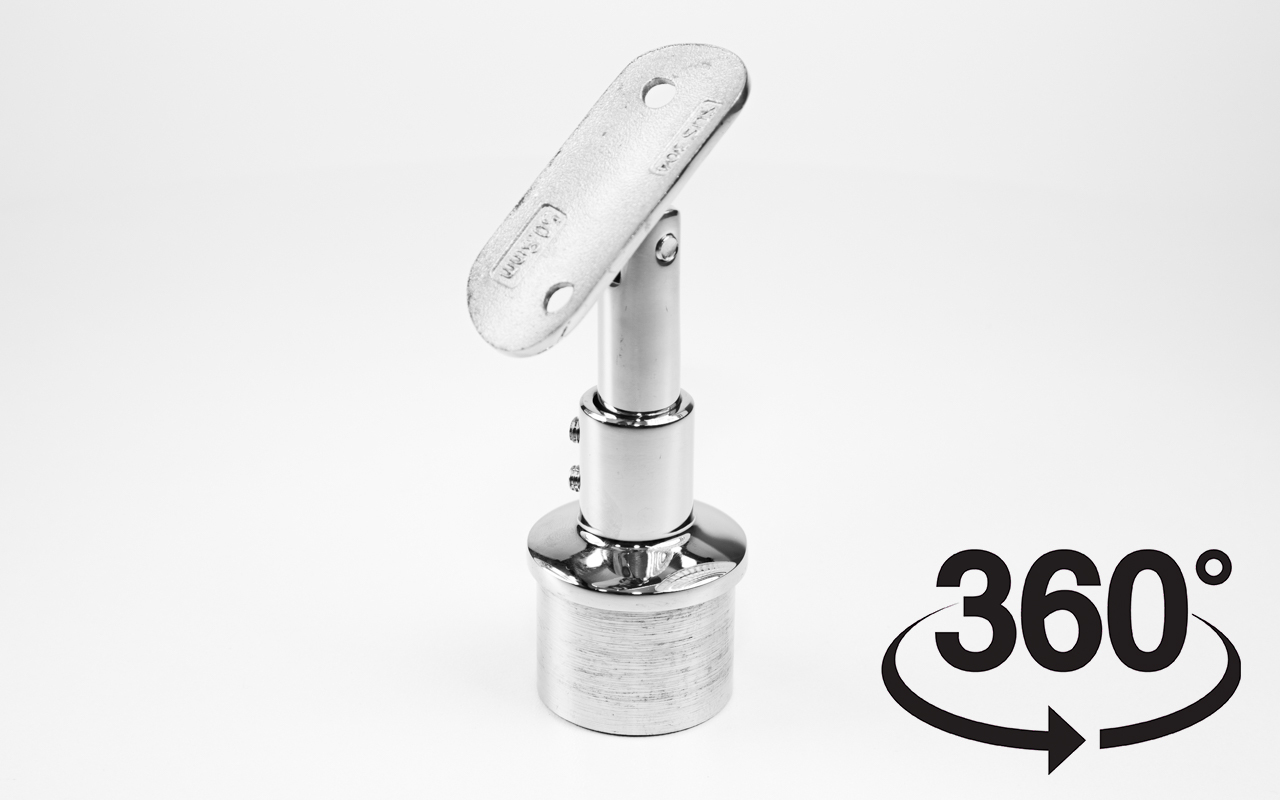 Наконечник регулируемый по высоте на стойку Ø38.1х1.5 мм, с регулируемым ложементом под поручень Ø50.8 мм. Наконечник литой, полированный, нержавеющий. Марка стали - AISI 304