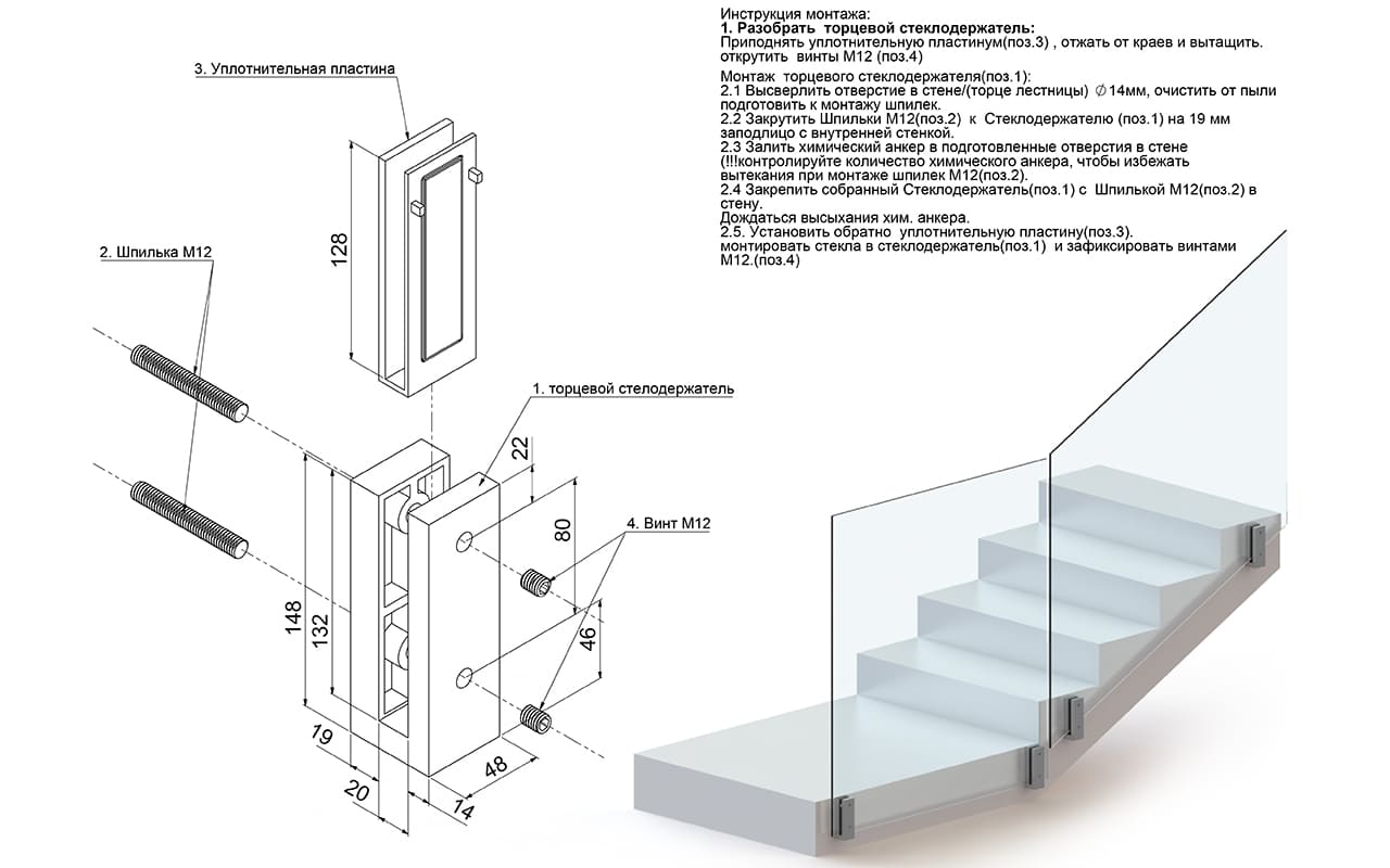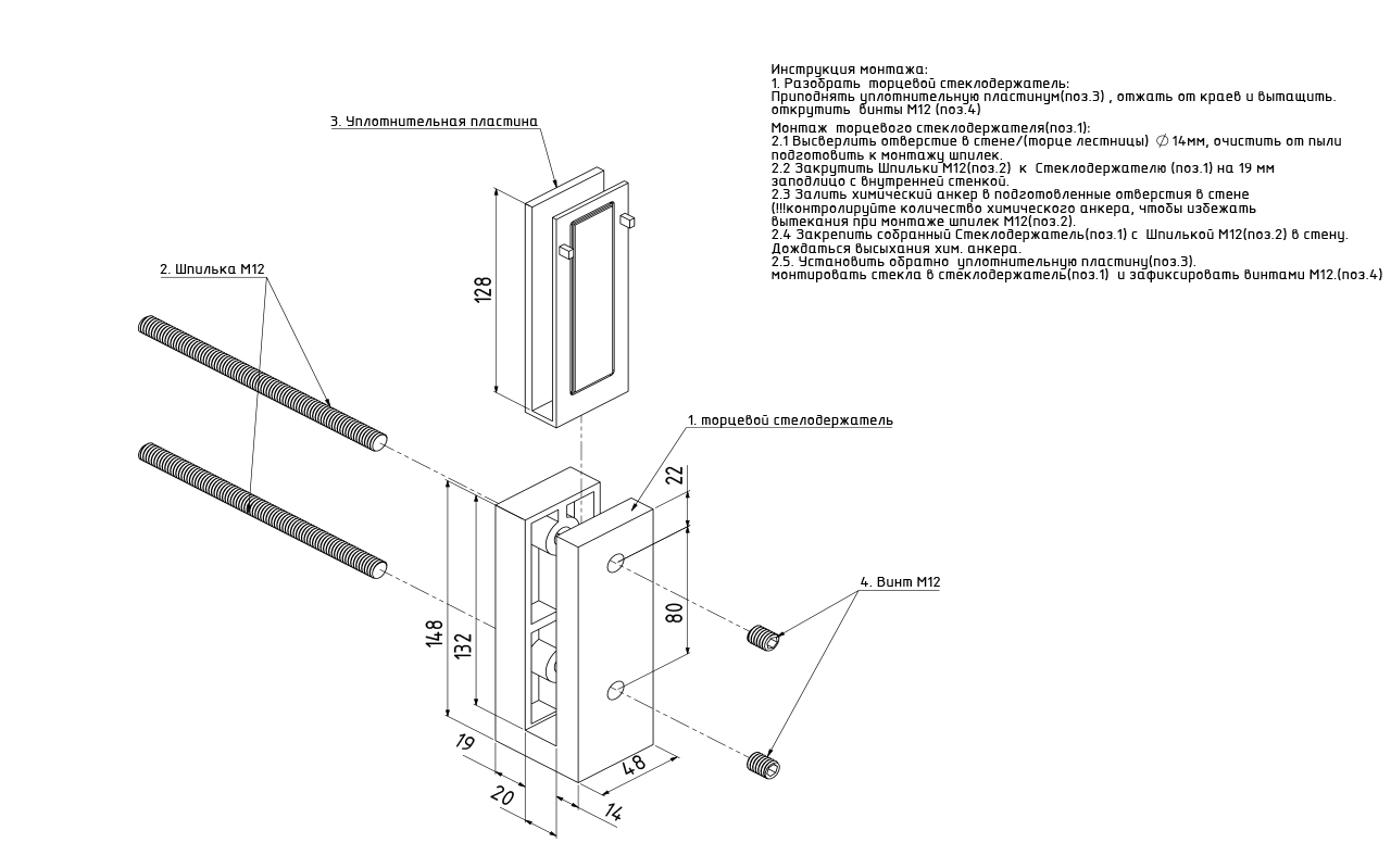 Стеклодержатель нужно крепить к стене на 2 шпильки и хим.анкер