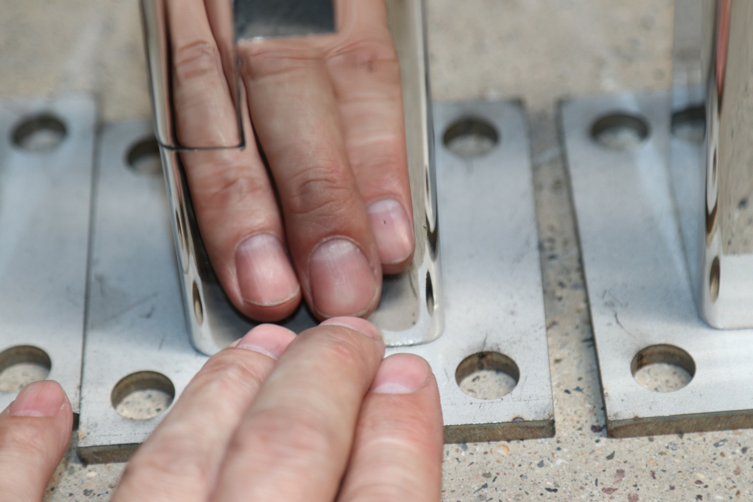 - кромку стекла можно закрыть с помощью маленького п-образного профиля из нержавеющей стали. Купить у нас: Ф-0454 и Ф-0455.