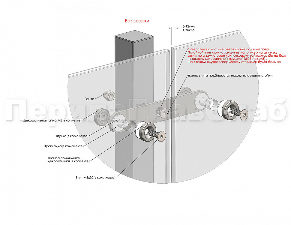 Основное отличие предлагаемой нами модели от аналогов — это увеличенная длина пластины. Те, кто уже работал со стеклом, знают, как трудно поймать малейшее отклонение линейных размеров стекла, особенно на наклонных лестничных маршах. При этом отклонение может возникнуть как в случае изменения длины или ширины стекла во время изготовления, так и при смещении оси просверленных в стекле отверстий под винты стеклодержателей. Избежать этого практически невозможно, так как двух абсолютно одинаковых стекло на свете не бывает. А вот запас по длине обеспечивает возможность более простой, а значит быстрой установки стекла на ограждение во время монтажа. При этом нивелируется отклонение осей отверстий в стекле. Мы рекомендуем подваривать элементы между собой, чтобы их не расхитили вандалы или злоумышленники.