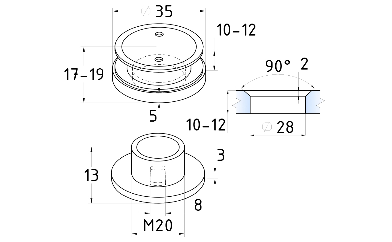 Точечный стеклодержатель 22-26 мм, регулируемый, под зенковку, для стекла 10-12 мм t507 SSS купить в Самаре