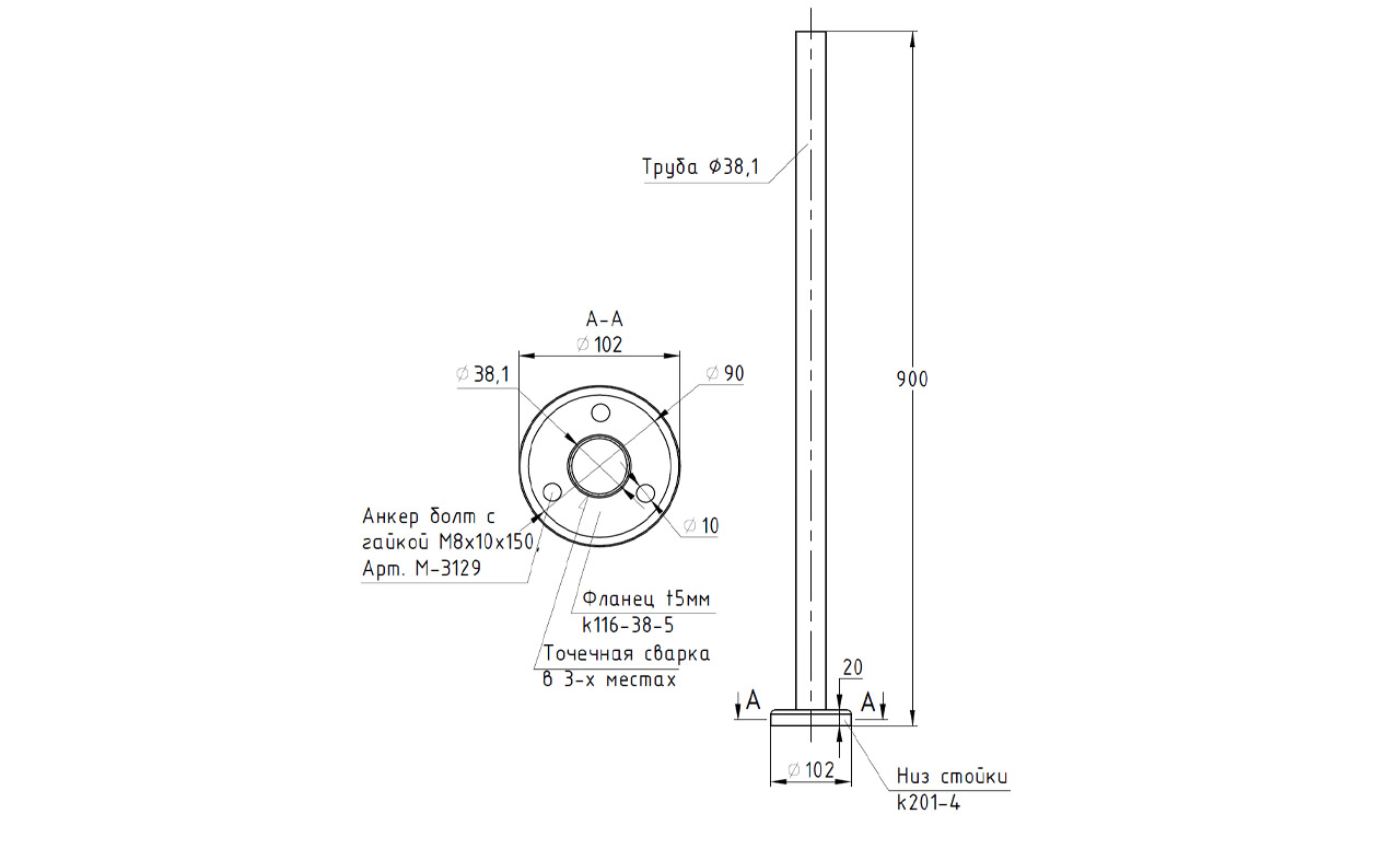 Готовая стойка Ø38,1 мм, с фланцем, высота 900 мм, полированная (AISI 304) k701