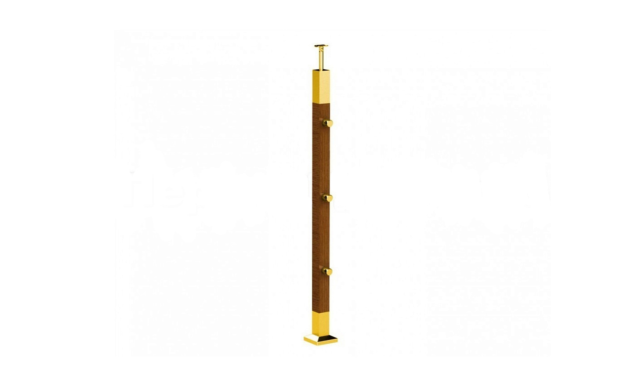 Готовая стойка 40х40х950 мм, деревянная, со вставками из нержавеющей стали 2х100 мм, с 3 ригеледержателями, под золото