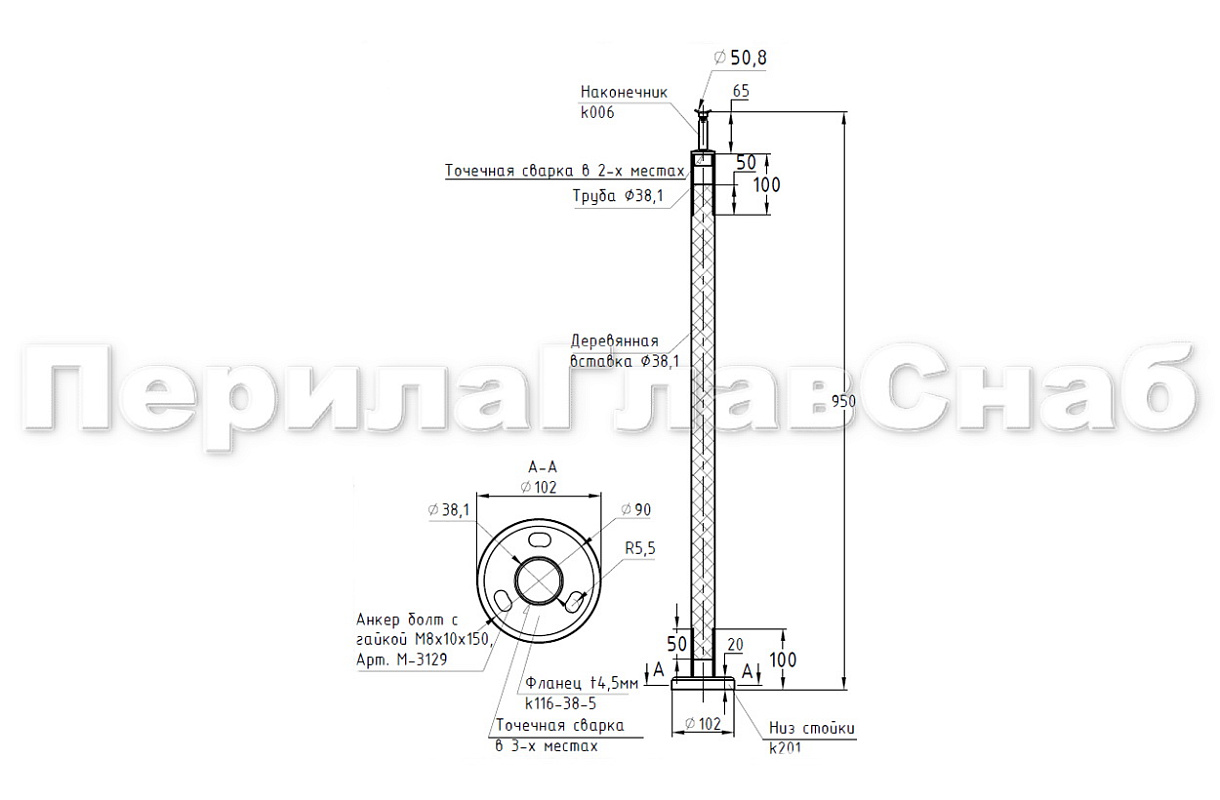 Готовая стойка Ø38,1х950мм деревянная, со вставками из нержавеющей стали 2х100мм базовая