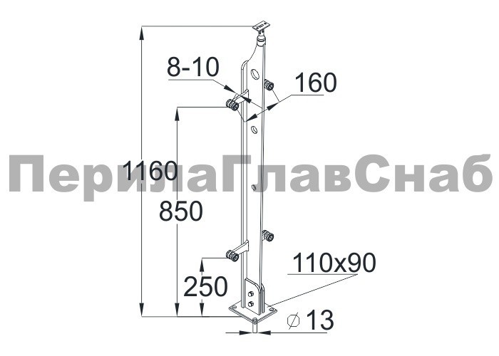 Стойка круглая Ø38.1: 2 литых зажимных стеклодержателя, под стекло 8-10 мм, полированная, высота 950 мм (AISI 304) k722-L купить в Самаре