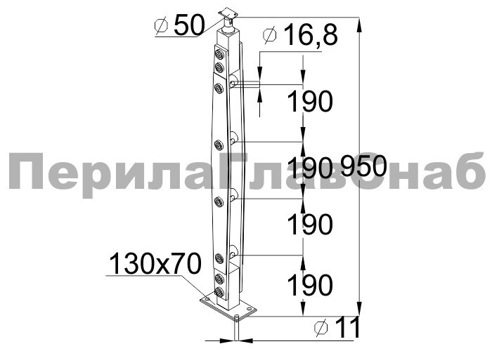 Стойка квадратная 40х40: 4 литых стеклодержателя, полированная, высота 950 мм (AISI 304) k746 купить в Самаре