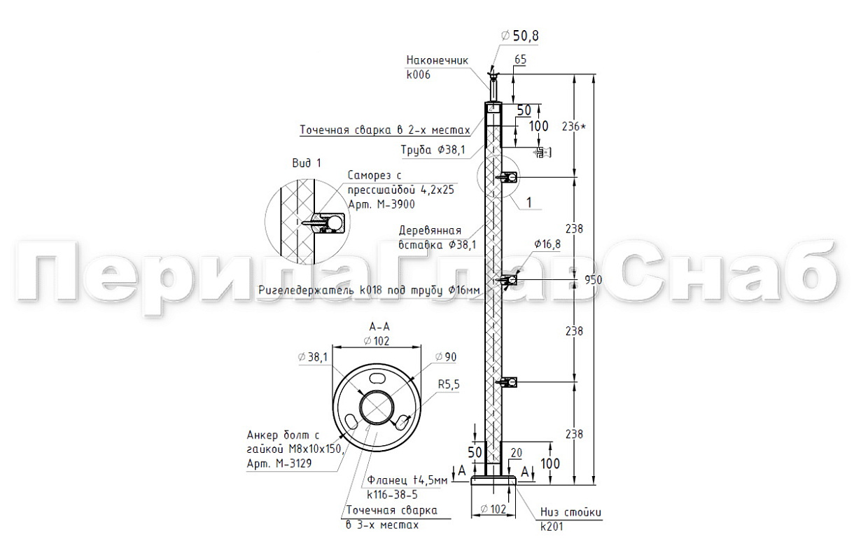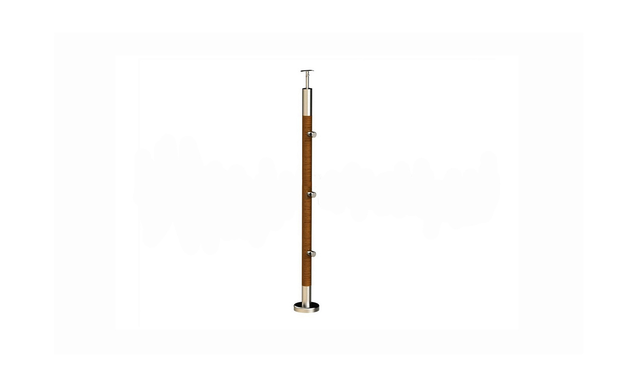 Готовая стойка Ø38,1х950 мм деревянная, со вставками из нержавеющей стали 2х100 мм с 3 ригеледержателями k741-1