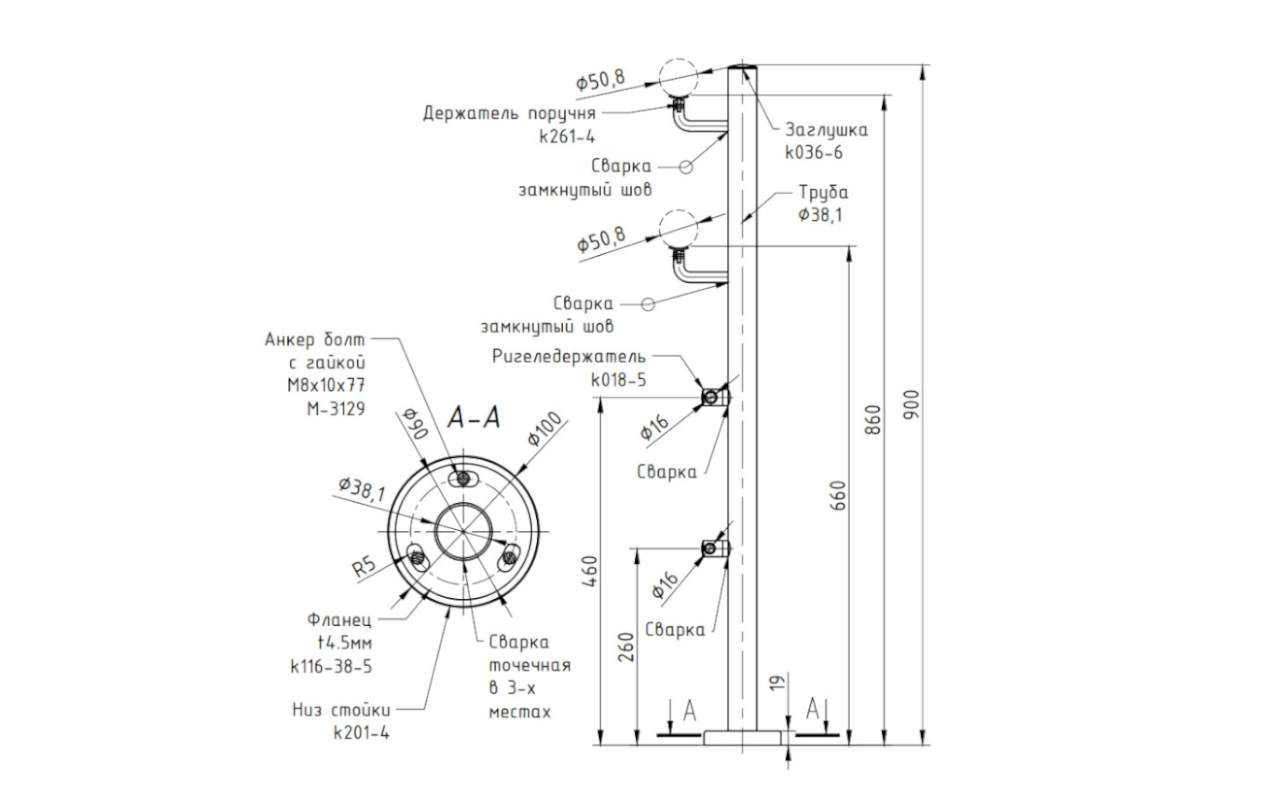 Готовые стойки – это экономия вашего времени и денег. Приобретая готовую стойку Вы можете собрать ограждение сами, не привлекая монтажную бригаду и экономя денежные средства на монтаже. Стойка легко монтируется к полу благодаря треханкернуму фланцу с отверстиями под анкер-болт М8 ( М-3129, М-3843, М-3838), а крепеж скрывает декоративная крышка идущая в комплекте стойки. Поручень из нержавеющей стали так же легко закрепить при помощи сверла по нержавеющей стали (k961-03, k961-03.5, k961р-03.5, k961р-03) и самореза ( М-3850, М-3847, М-3215). Либо при помощи заклепки ( М-3214) и винта М6 ( М-3973), для крепления при помощи заклепок необходимо растачивать отверстие в ложементе. Если вы используете пластиковый ( k893, k897, k892, k891, k894, k895, k899) или деревянный поручень, то его можно закрепить при помощи саморезов ( М-3217)