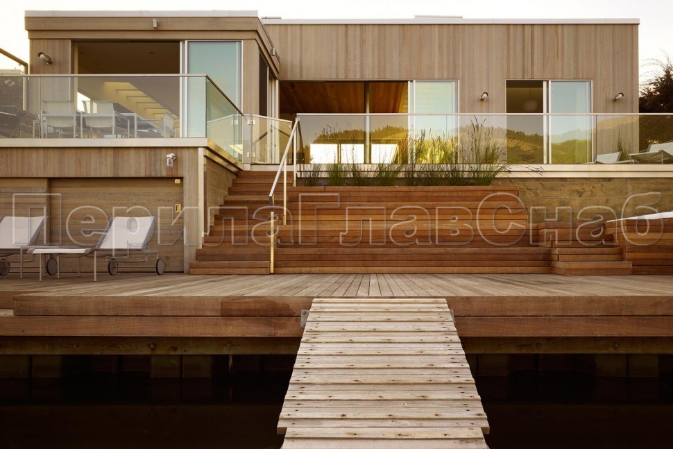 Ограждение с деревянным поручнем с зажимными стеклодержателями и стойками