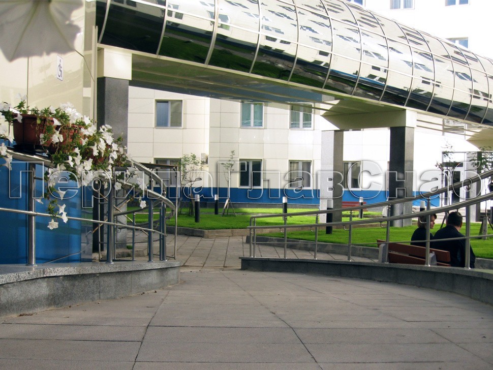 В здании больницы, возведенной широко известной СУ-155, была установлена лестница, облицованная гранитными вставками на каждой ступени и установлено ограждение с изогнутым поручнем из нержавеющей стали.