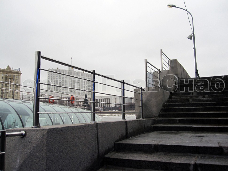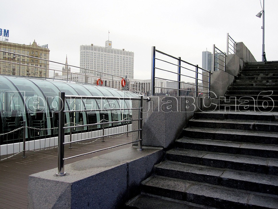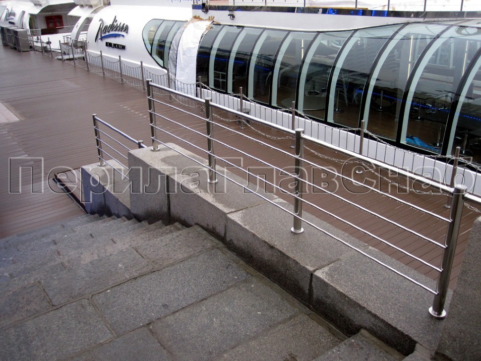 Вдоль набережной причала «Рэдиссон Ройал» было установлено многоуровневое ограждение из полированной нержавеющей стали на усиленных круглых стойках с четырьмя ригелями параллельно поручню, специально для этого проекта смещенному с верхней точки стоек на несколько сантиметров вниз, в целях придания уверенной солидности внешнему виду конструкции.
