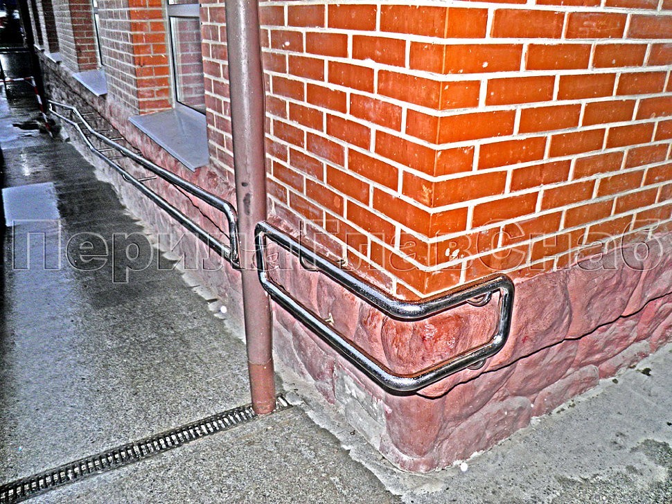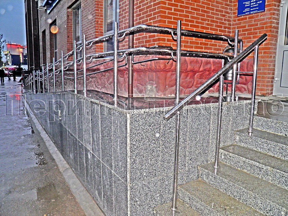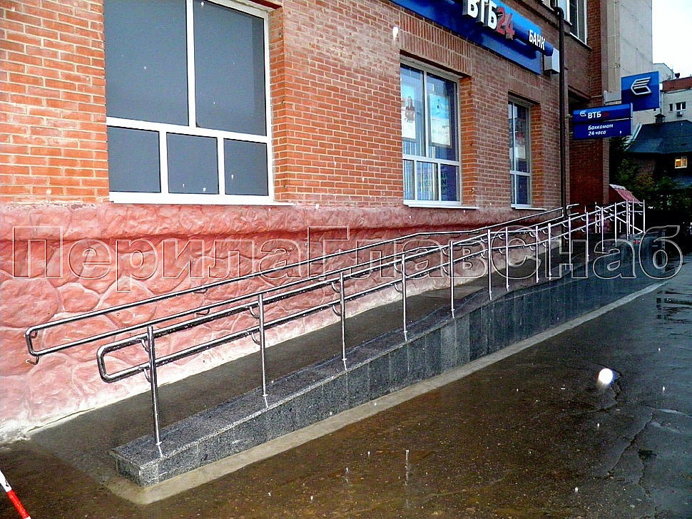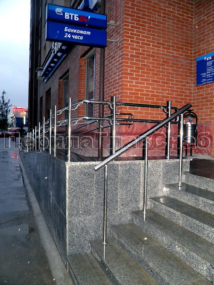 А на самом ограждении пандуса была реализована система увеличения стоек по высоте относительно поручня, что так же, как и предыдущий пример пристенного поручня, о котором говорилось ранее, стало яркой и запоминающейся деталью архитектуры здания столичного банка.
