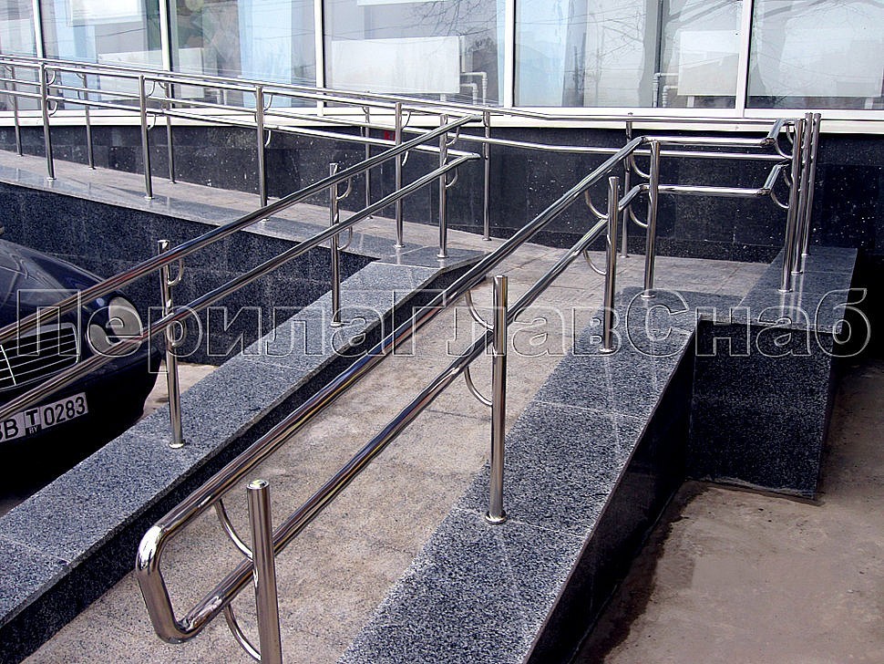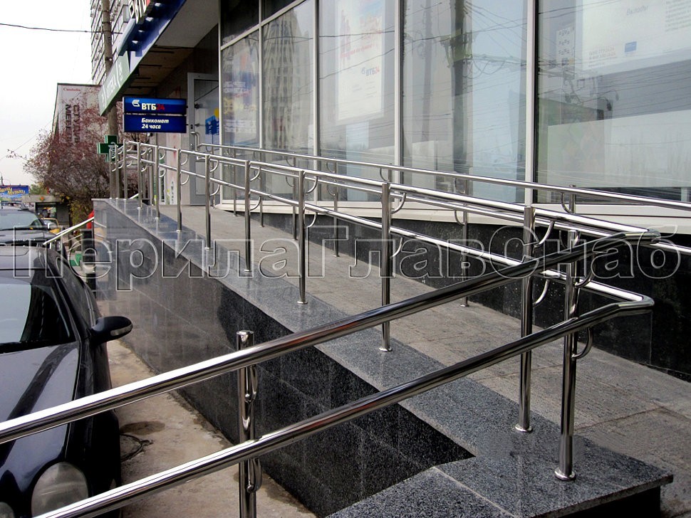 У входа в здание банка была установлена система из пандуса для инвалидов и многоуровневые поручни из нержавеющей стали поверх гранитного парапета. Характерной особенностью конструкции являлось настоятельное требование со стороны заказчика не использовать заполнение между стойками в виде традиционных ригелей, оставляя и даже нарочито подчеркивая перила и стойки ограждения, дабы вид сверкающей нержавейки не затмевал основание, покоящееся на облицовке благородной плиткой натурального гранита.