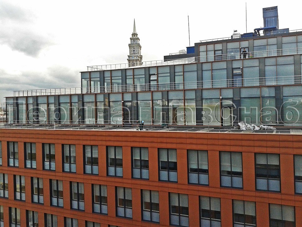 В бизнес-квартале Алкон - центре нового поколения класса А, компания «ПерилаГлавСнаб» произвела монтаж ограждения для парапетов кровли и лестниц.