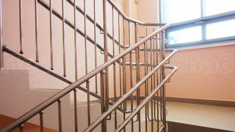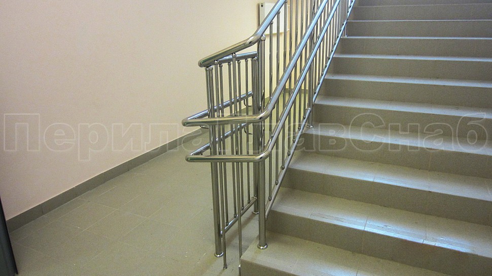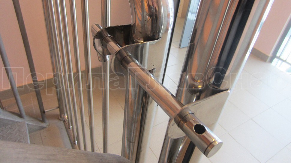 - У лестницы же стойки имеют высоту чуть большую — 950 мм, труба Ø38 мм. Устанавливаются на расстояние через две ступени в третью, на прямых участках не более 1000 мм друг от друга. Наконечник выполнен в декоративном стиле в виде сферы. Для большей безопасности установлены семь ригелей между стойками, и, в отличие от пандуса, они крепятся к стойке сваркой снизу и установлены вертикально. Поручень двойной диаметром 38 мм установлен на высоте 700 мм и 900 мм, крепится к стойке на выносных держателях и на поворотах завязан бубликом.