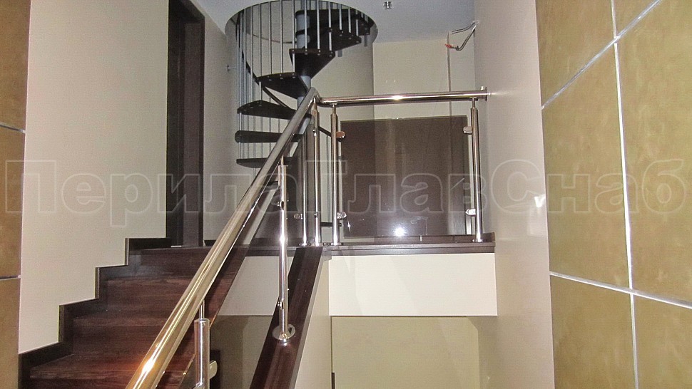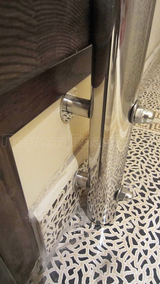 Стекло крепится к стойкам на зажимных стеклодержателях из полированной нержавеющей стали. Верх стойки штырь, низ стойки декоративная крышка. Окончание поручня заглушка.