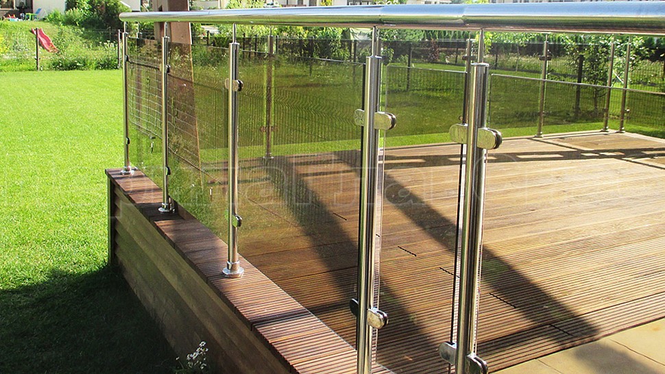 Такой заказ был принят и одобрен на монтаж ограждения террасы из полированной нержавеющей стали со стеклом, высотой 950 мм. Стойка труба диаметром 38 мм, низ стойки цанга, верх стойки штырь, с закаленным стеклом цвет "бронза" 8 мм и с полировкой кромок по периметру, с литыми стеклодержателями и порученем из полированной нержавеющей стали диаметром 50 мм. Стойки устнавливаются в горизонте с шагом кратно 900-1200 мм на фланце в деревянный настил на саморезах. Поручень завязан отводами диаметром 50 мм. Крепление нержавеющих элементов ограждения между собой точечная аргонно-дуговая сварка, длина швов 2 мм, с последующей зачисткой и полировкой.