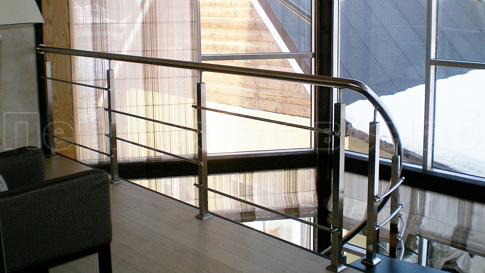 В загородный дом было установлено стильное ограждение из шлифованной нержавеющей стали высотой 950 мм с двумя ригелями диаметром 16 мм и поручнем 50 мм, стойками 40Х40 мм, которые устанавливаются через ступень на вторую.