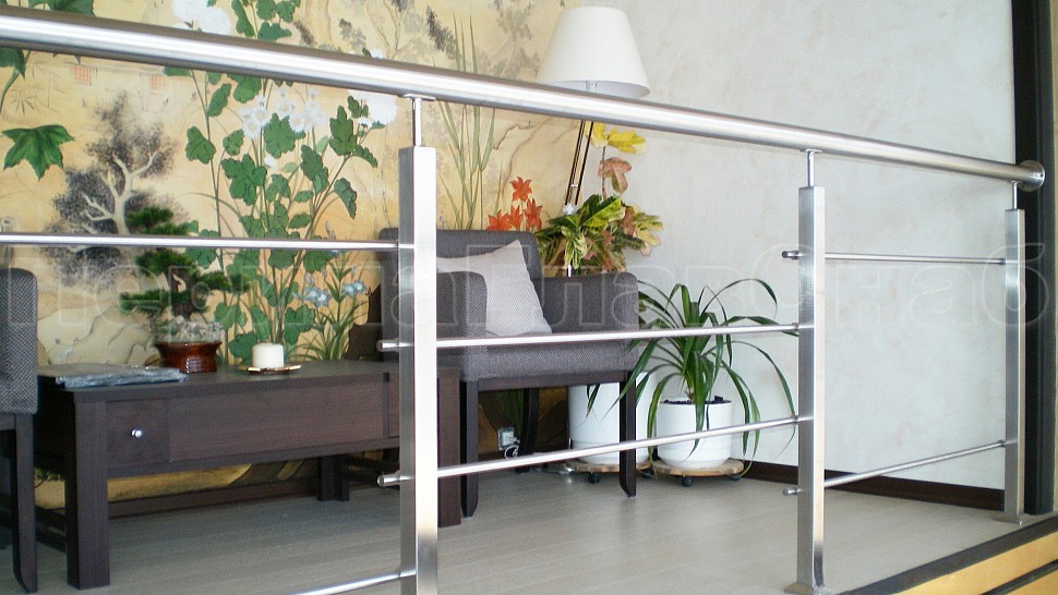 Верх стойки штырь, низ стойки фланец с крышкой. Окончание поручня заглушка, уход поручня в стену через фланец. Поручень у данной конструкции завязан, а ригель выполняет не только защитную функцию, но и декоративную