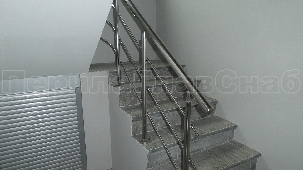 Сквозь стойку с заранее просверленными отверстиями, устанавливаются через три ступени в четвертую, на прямых участках не более 1250 мм друг от друга, наконечник стойки штырь; ригель диаметром 16 мм, ригель крепится к стойке сваркой снизу, низ стойки декоративная крышка диаметром 56 мм, поручень труба диаметром 50 мм, окончание поручня заглушка, поручень завязан, ригель завязан. Крепление нержавеющих элементов ограждения между собой точечная аргонно-дуговая сварка, длина швов 2 мм, с последующей зачисткой и полировкой.