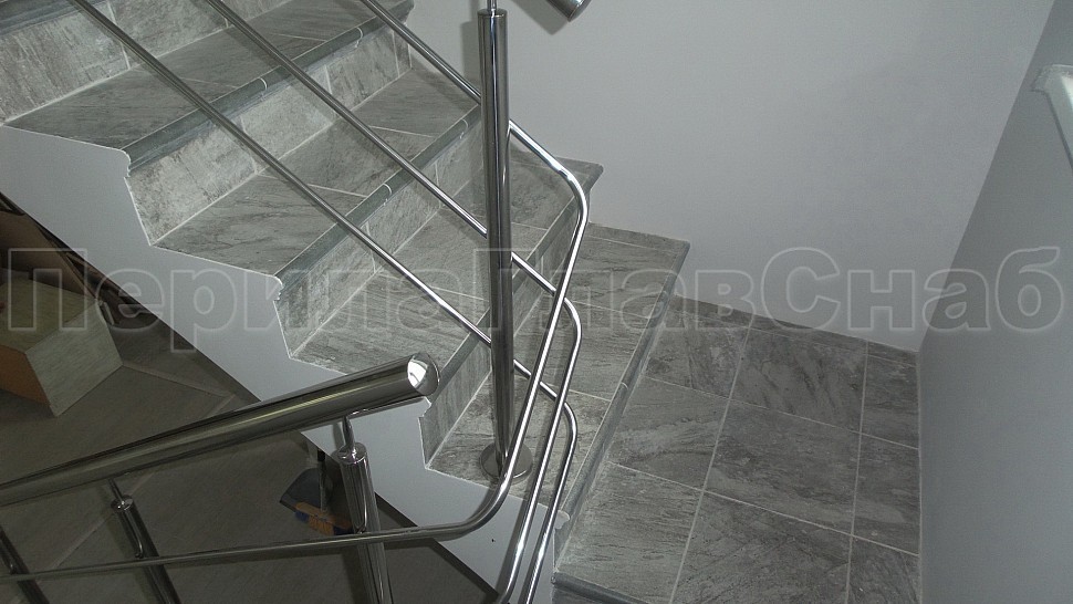 В загородном доме было установлено трехригельное ограждение из полированной нержавеющей стали. Высотой 950 мм, стойками диаметром 38 мм, креплением сверху на трех анкерную закладную на площадке, на маршах крепление торцевое методом бурения диаметром 12 мм на глубину 50-70 мм, на анкер-болт с колпачковой гайкой.