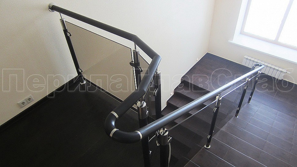 В загородный дом, было установлено лестничное ограждения высотой 950 мм с бронзовым каленым стеклом толщеной 8 мм, с деревянным поручнем диаметром 50 мм, стойки диаметром 50 мм из полированной нержавеющей стали с деревянными вставками устанавливаются через две ступени на третью. Верх стойки штырь, низ стойки декоративная крышка. Окончание поручня заглушка. Поручень завязан, свариваемые швы шлифуются и полируются до блеска. Наши лестницы и ограждения всегда найдут место в вашем доме. Впишутся в любой интерьер. Московская область, Солнечногорский район, д.Якиманское
