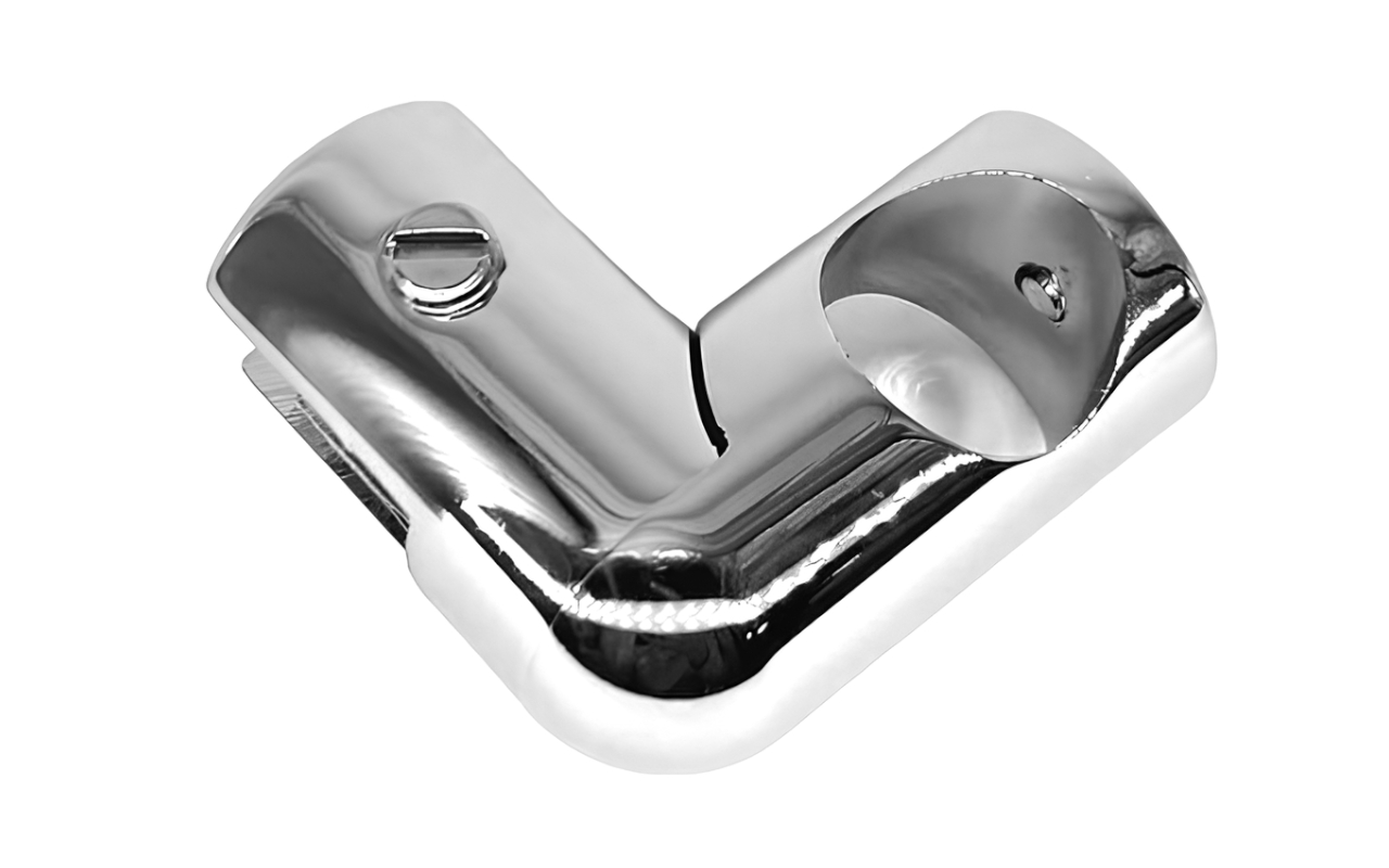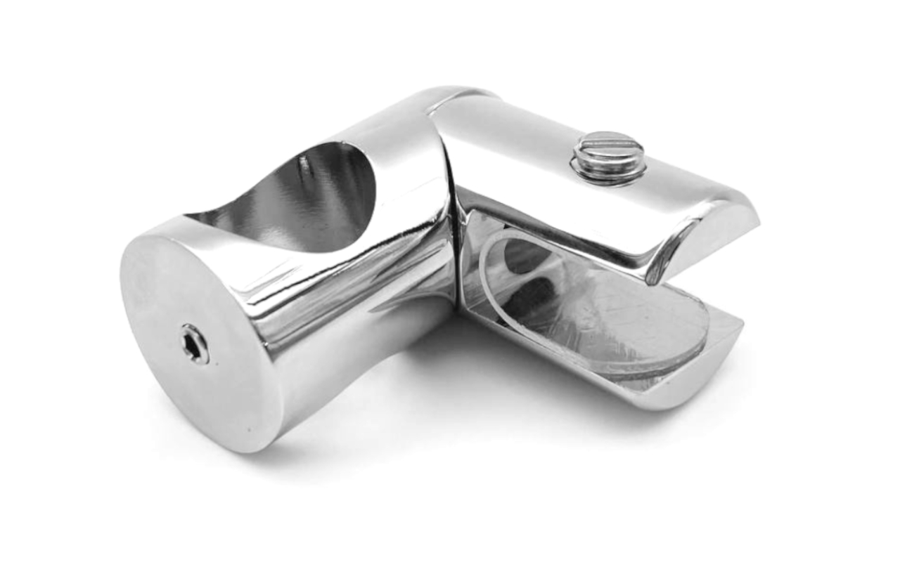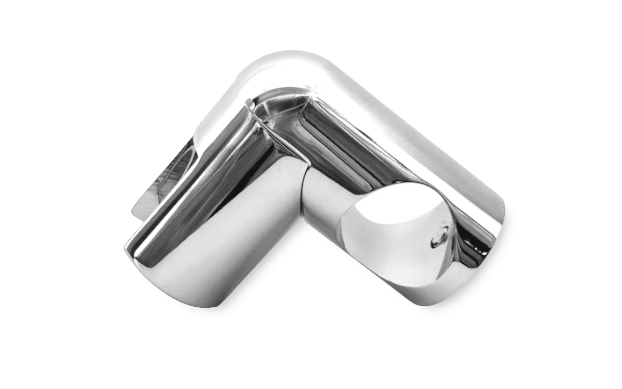 Коннектор предназначен для крепления круглой трубы 19 мм к стеклу в горизонтальной ориентации параллельно стеклу, при монтаже штанг верхней обвязки душевых кабин.