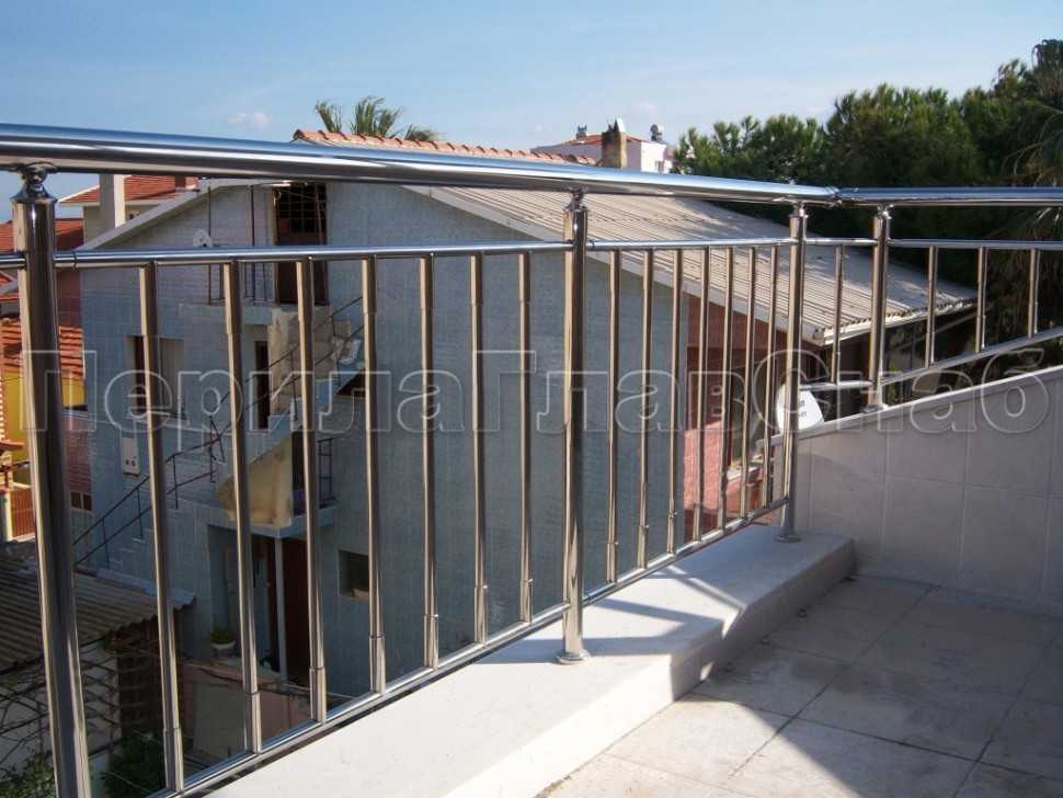 - В качестве поручня - перфорированная круглая труба 25 мм. Заполнение из вертикально зафиксированных нержавещих труб.