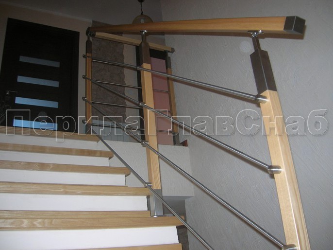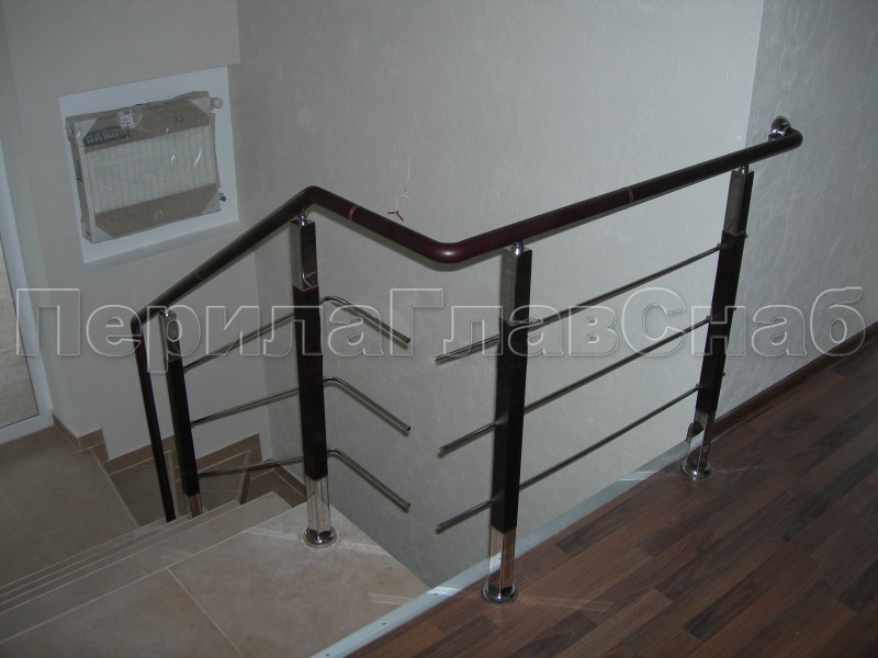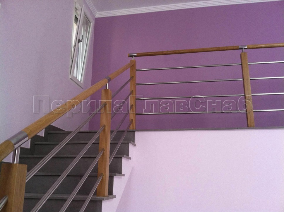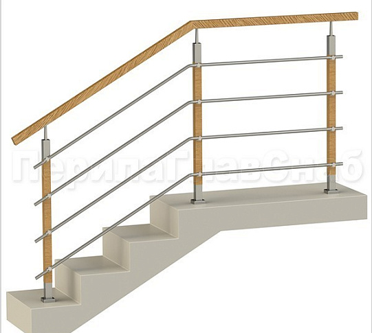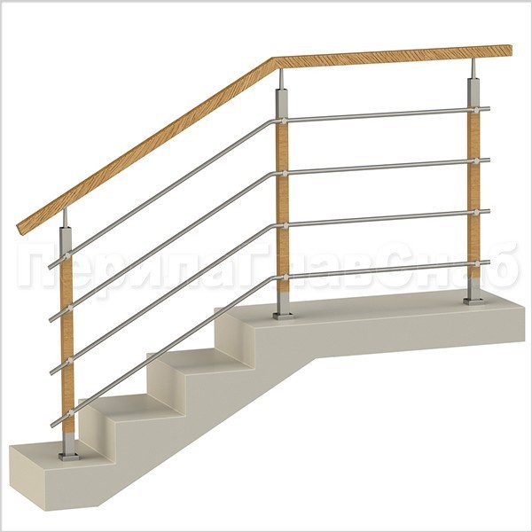 Четыре ригеля на держателях, квадратный деревянный поручень и стойки с деревянными вставками